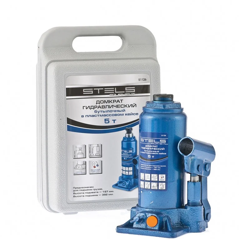 Домкрат гидравлический бутылочный, 5 т, H подъема 197-382 мм, в пластиковом кейсе Stels 51126