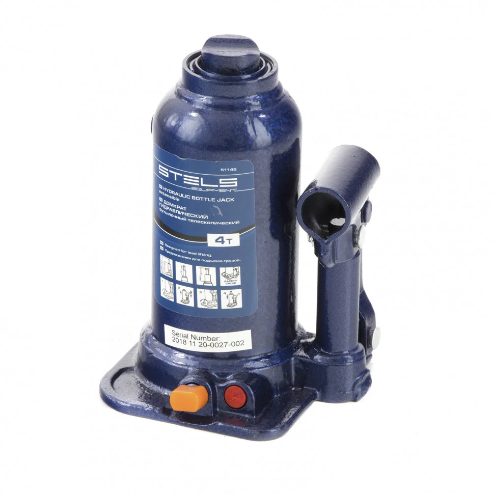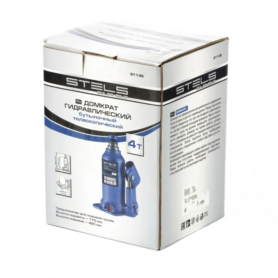 Домкрат гидравлический бутылочный телескопический Stels 51145 используется для поднятия грузов весом до 4 т с небольшим рабочим усилием. Телескопический механизм обеспечивает увеличенную высоту подъема до 420 мм, а высота подхвата 170 мм оптимальна для авто с большим клиренсом. Домкрат можно использовать в гараже для самостоятельного ремонта автомобиля или для решения профессиональных задач в автосервисе.ПреимуществаКлапан безопасности не допускает поднятия грузов свыше заявленной нормы, такая защита предотвращает перегрузку и поломку домкрата.Прочность и долгий срок службы домкрата обеспечивается за счет стального основания и корпуса.Станина и корпус приварены - монолитное соединение повышает надежность конструкции.Небольшой вес домкрата 3,64 кг позволяет легко транспортировать его и хранить в багажнике машины.