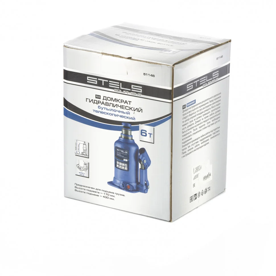 Домкрат гидравлический бутылочный телескопический Stels 51146 используется для поднятия грузов весом до 6 т с небольшим рабочим усилием. Телескопический механизм обеспечивает увеличенную высоту подъема до 430 мм, а высота подхвата 170 мм оптимальна для авто с большим клиренсом. Домкрат можно использовать в гараже для самостоятельного ремонта автомобиля или для решения профессиональных задач в автосервисе.ПреимуществаКлапан безопасности не допускает поднятия грузов свыше заявленной нормы, такая защита предотвращает перегрузку и поломку домкрата.Прочность и долгий срок службы домкрата обеспечивается за счет стального основания и корпуса.Станина и корпус приварены - монолитное соединение повышает надежность конструкции.Небольшой вес домкрата 5,4 кг позволяет легко транспортировать его и хранить в багажнике машины.