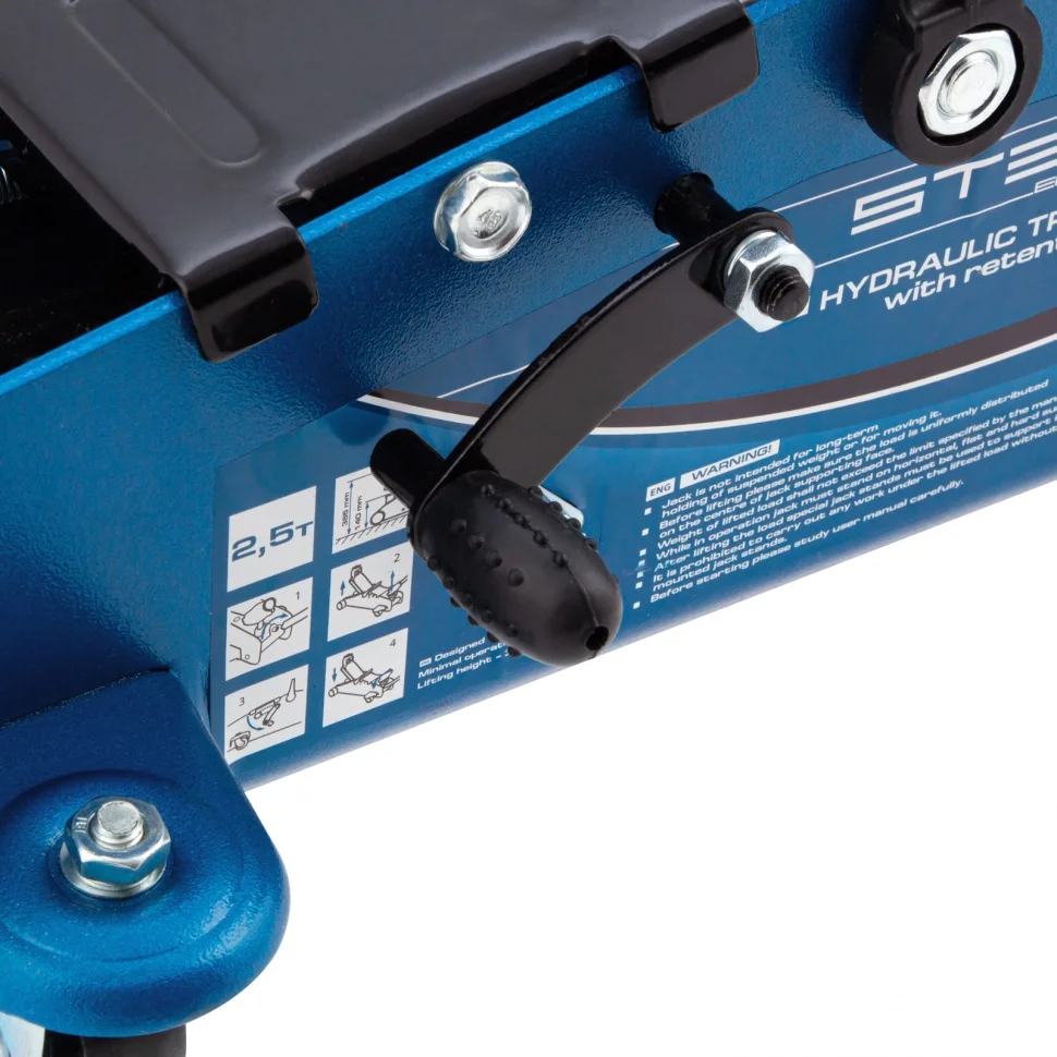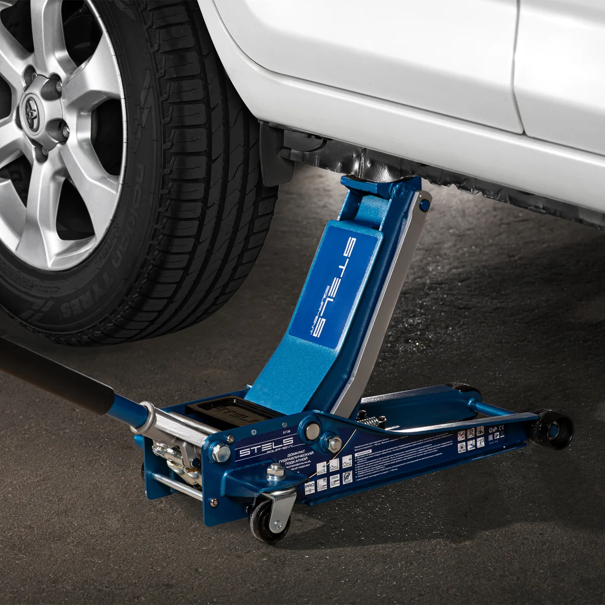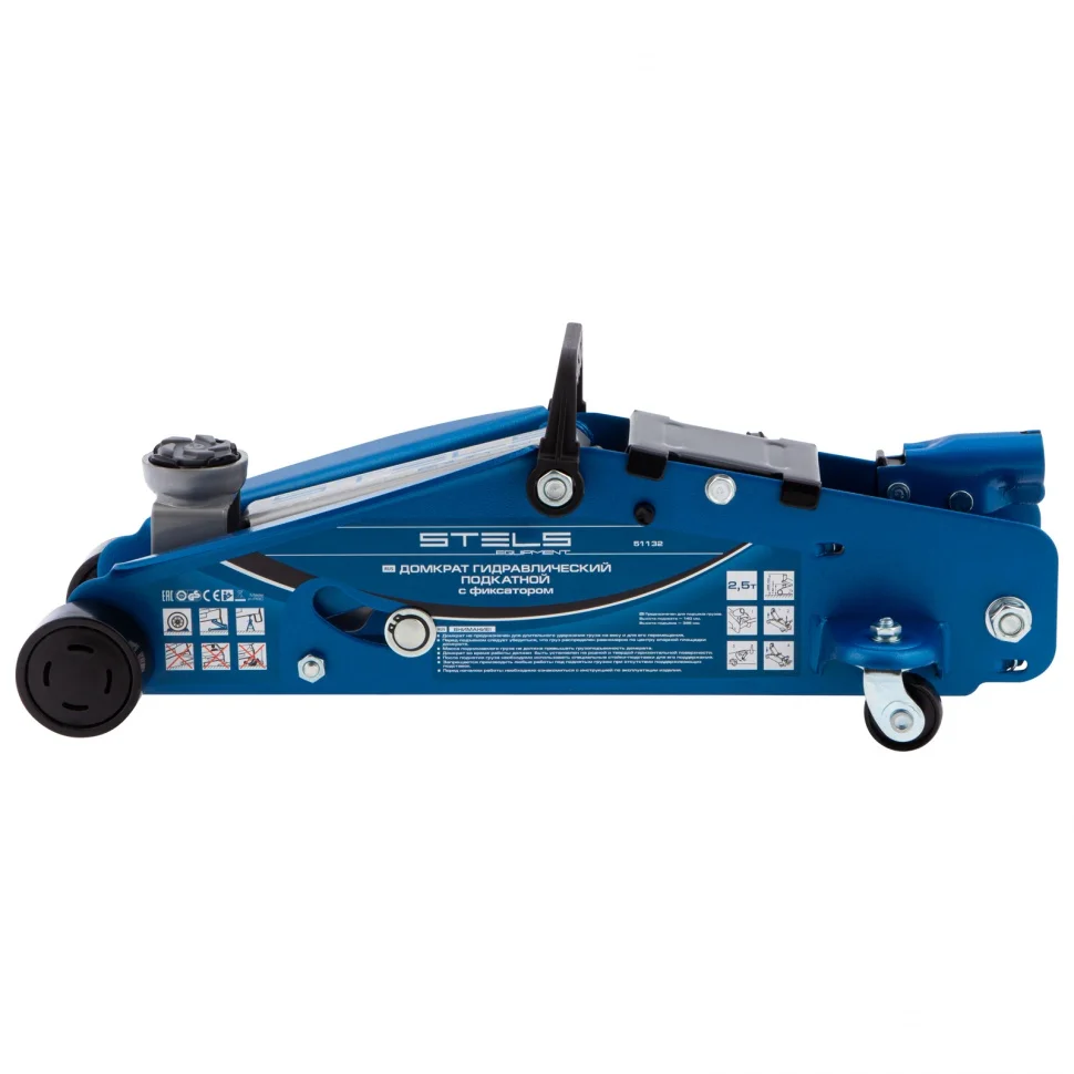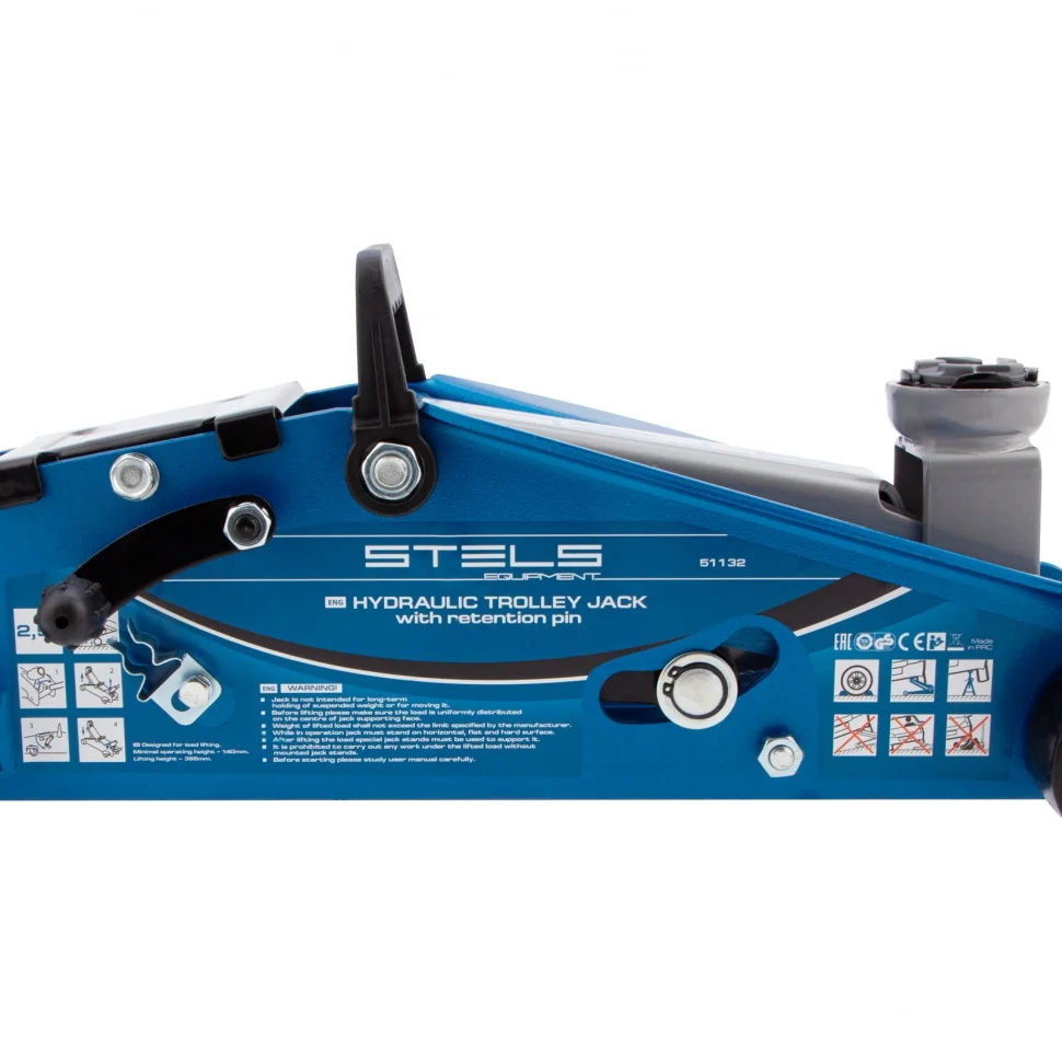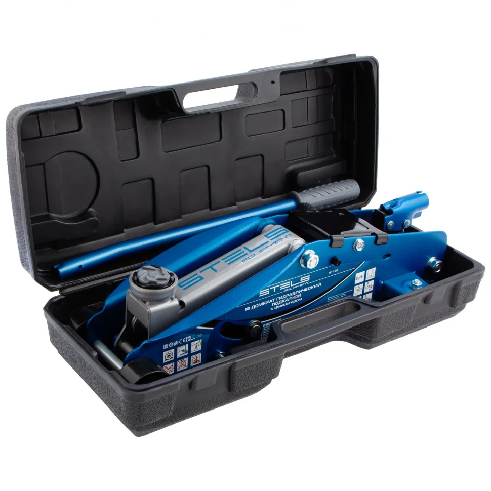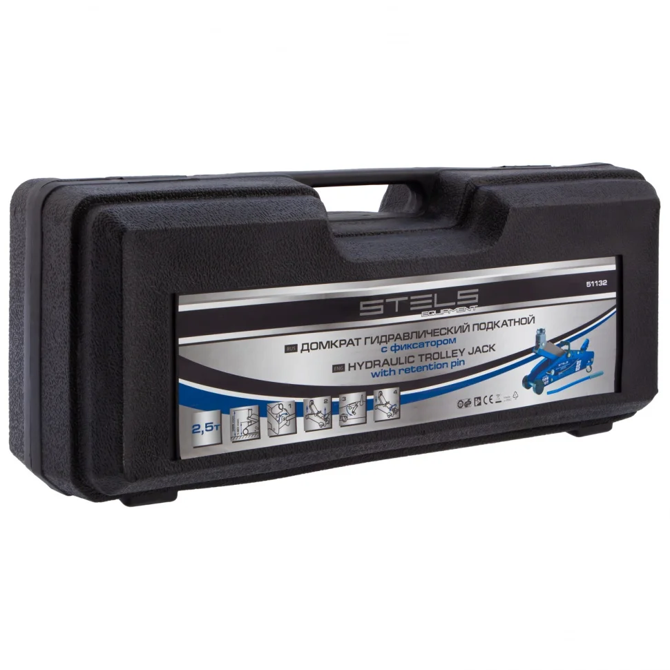 Подкатной гидравлический домкрат Stels Safety Pin 51132 с фиксатором, с высотой подхвата 140 мм, поставляющийся в кейсе, позволяет поднимать грузы весом до 2,5 т на высоту 385 мм. Используется для обслуживания автомобилей со стандартным дорожным просветом. Домкрат подходит для самостоятельного обслуживания авто.