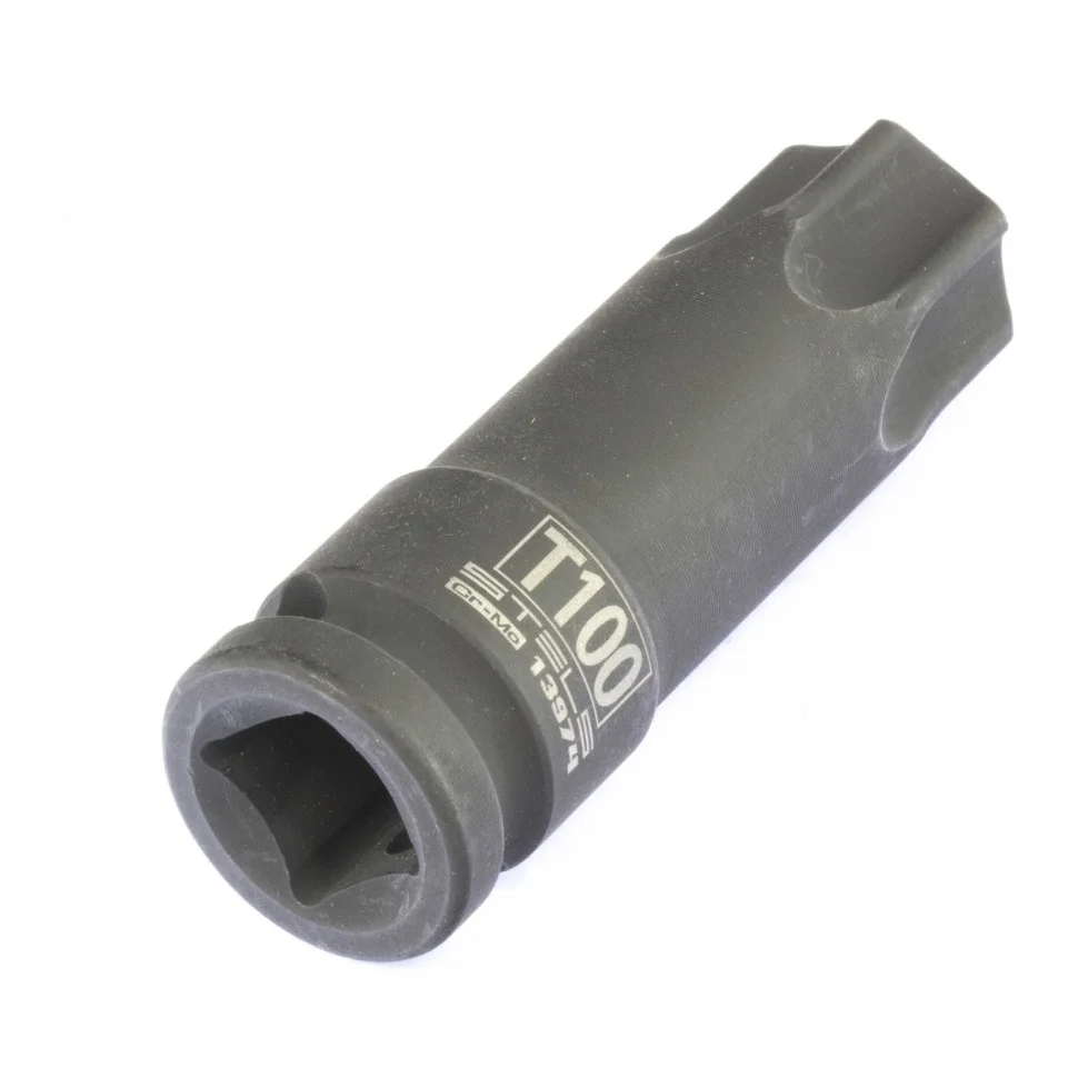 Ударная головка TORX 100 Stels 13974 с посадочным квадратом 1/2 дюйма применяется для монтажа и демонтажа крепежных элементов с помощью пневматического или электрического гайковерта. Отличается высокой прочностью и способностью выдерживать динамические нагрузки, поэтому подходит для профессионального использования на станциях техобслуживания.ПреимуществаВысокий ресурс — головка из хромомолибденовой стали, закаленная до твердости 44-48 HRC, устойчива к износу и деформациям.Защита от коррозии — фосфатное матовое покрытие предотвращает разрушение головки под воздействием влаги.Удобная работа в труднодоступных местах — длина головки составляет 78 мм.