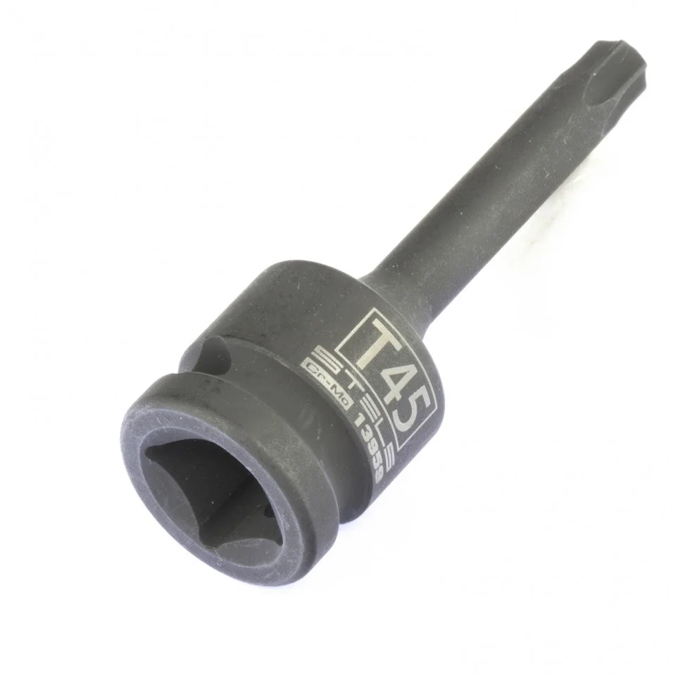 Ударная головка TORX 45 Stels 13959 с посадочным квадратом 1/2 дюйма применяется для монтажа и демонтажа крепежных элементов с помощью пневматического или электрического гайковерта. Отличается высокой прочностью и способностью выдерживать динамические нагрузки, поэтому подходит для профессионального использования на станциях техобслуживания.ПреимуществаВысокий ресурс — головка из хромомолибденовой стали, закаленная до твердости 44-48 HRC, устойчива к износу и деформациям.Защита от коррозии — фосфатное матовое покрытие предотвращает разрушение головки под воздействием влаги.Удобная работа в труднодоступных местах — длина головки составляет 78 мм.