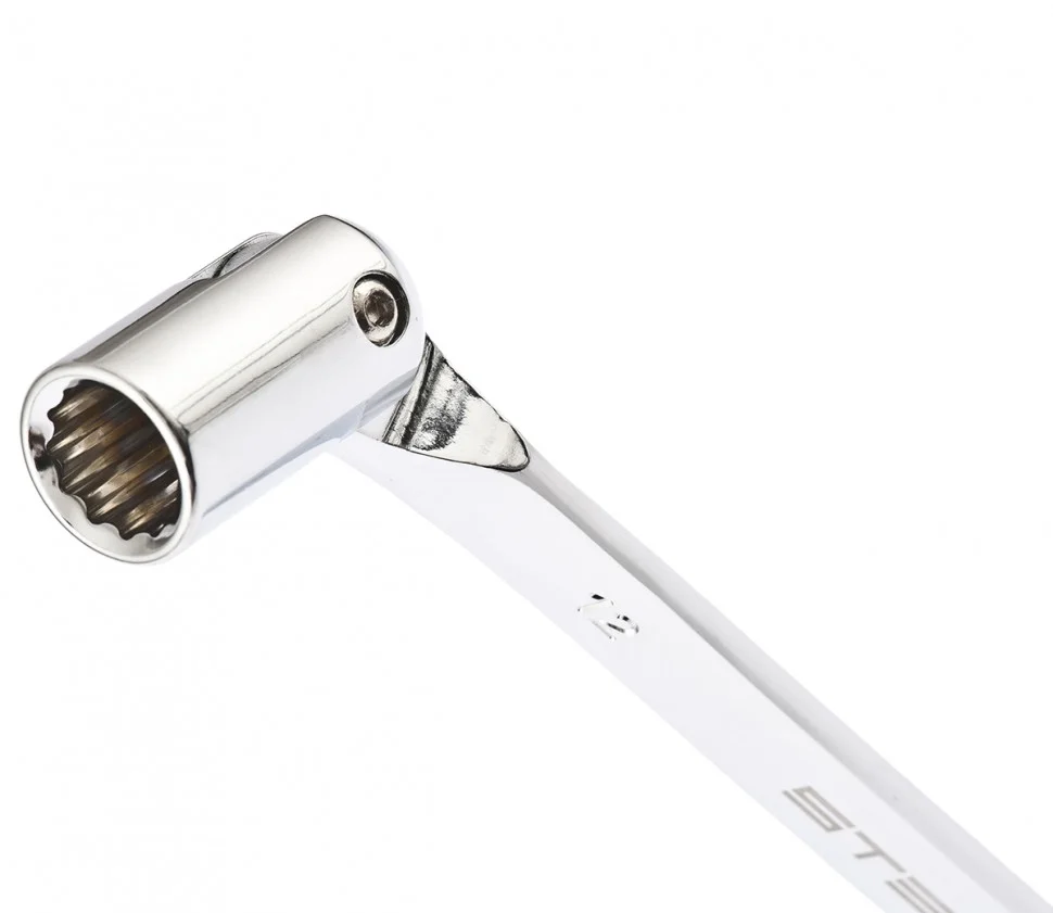 Ключ шарнирный Stels 14953, 12 х 13 мм, CrV, предназначен для работы с болтовыми и гаечными соединениями. Оснащен 2 рабочими головками размером 12 и 13 мм с 12-гранным профилем. Обеспечивает плотный обхват крепежа и удобен для работы в стесненных условиях — величина хода составляет всего 30 градусов. Ключ используется для ремонта автомобилей и других слесарно-монтажных работ.ПреимуществаШарнирное крепление головок позволяет передавать крутящий момент под углом, что облегчает работу в труднодоступных местах.Ключ изготовлен из стали хромованадиевой группы, что гарантирует его высокую прочность.Твердость рабочих частей составляет 50 HRC, поэтому инструмент износостоек и долговечен.Поверхность ключа хромирована, поэтому он защищен от коррозии и механических повреждений.Зеркальное покрытие облегчает уход за инструментом — достаточно просто протереть его после окончания работы.