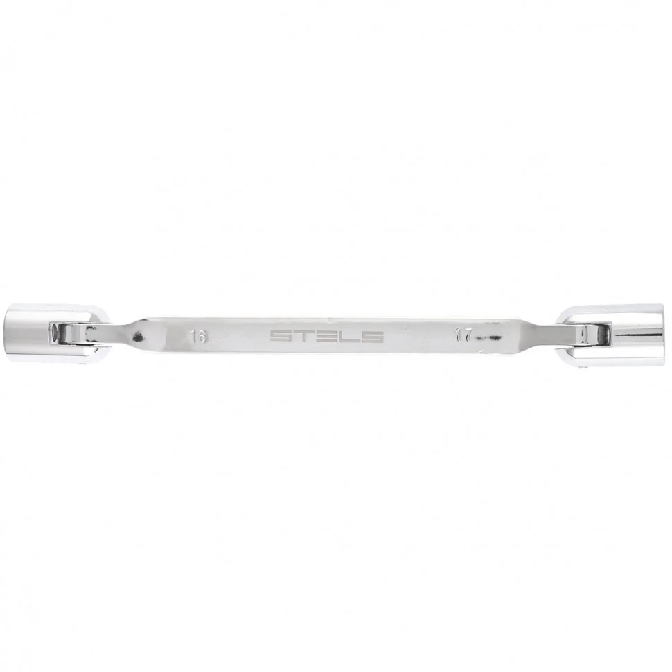 Ключ шарнирный Stels 14959, 16 х 17 мм, CrV, предназначен для работы с болтовыми и гаечными соединениями. Оснащен 2 рабочими головками размером 16 и 17 мм с 12-гранным профилем. Обеспечивает плотный обхват крепежа и удобен для работы в стесненных условиях — величина хода составляет всего 30 градусов. Ключ используется для ремонта автомобилей и других слесарно-монтажных работ.ПреимуществаШарнирное крепление головок позволяет передавать крутящий момент под углом, что облегчает работу в труднодоступных местах.Ключ изготовлен из стали хромованадиевой группы, что гарантирует его высокую прочность.Твердость рабочих частей составляет 50 HRC, поэтому инструмент износостоек и долговечен.Поверхность ключа хромирована, поэтому он защищен от коррозии и механических повреждений.Зеркальное покрытие облегчает уход за инструментом — достаточно просто протереть его после окончания работы.