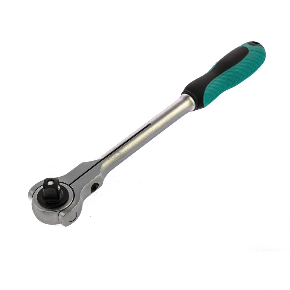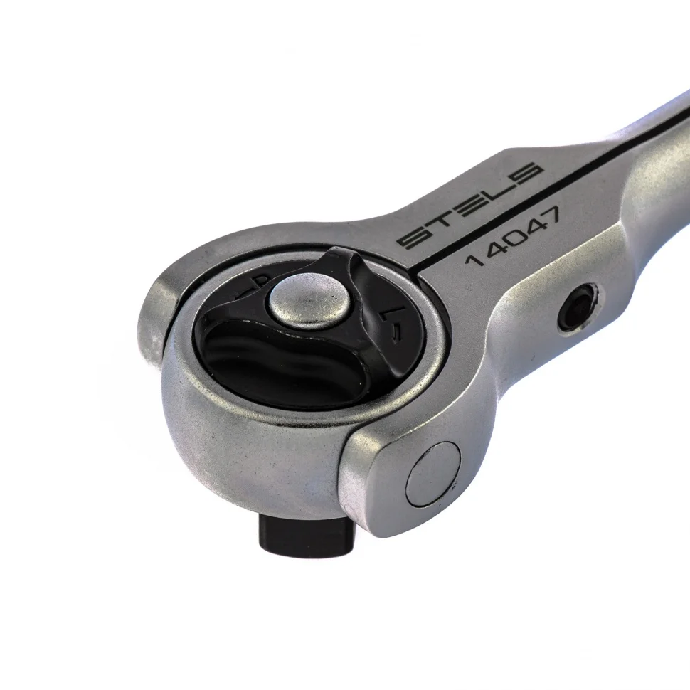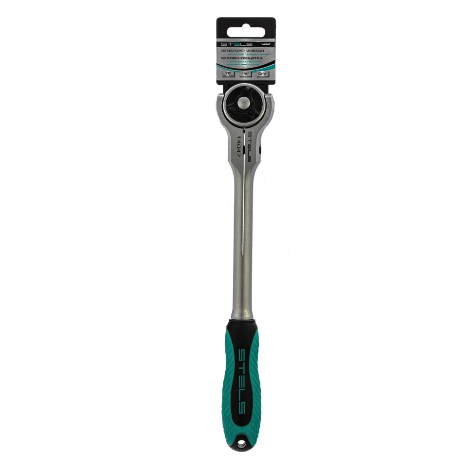 Ключ-трещотка Stels 14047 из стали CrV, с присоединительным квадратом 1/2 дюйма, быстрым сбросом и поворотной головой оснащен храповым механизмом с 72 зубцами. Ключ позволяет плавно и быстро монтировать и демонтировать резьбовые соединения при помощи торцевых головок, различных адаптеров и удлинителей. Шаг трещотки 5 градусов обеспечивает возможность работы в ограниченном пространстве. Инструмент востребован в сфере авторемонта, пригодится также и в быту.ПреимуществаКлюч-трещотка выдерживает большие нагрузки, так как изготовлен из стали хромованадиевой группы и обладает высокой прочностью.Хромированная поверхность устойчива к коррозии и механическим воздействиям.Шариковый фиксатор присоединительного квадрата надежно удерживает насадку.Поворотная голова позволяет работать с труднодоступными крепежами.Направление вращения храпового колеса меняется одним движением при помощи переключателя — можно и закручивать, и откручивать крепежи.Механизм быстрого сброса мгновенно освобождает присоединительный квадрат от насадки, экономя время на замену оснастки.Рифленая двухкомпонентная ручка эргономичной формы обеспечивает комфорт при работе.