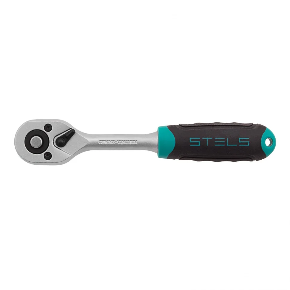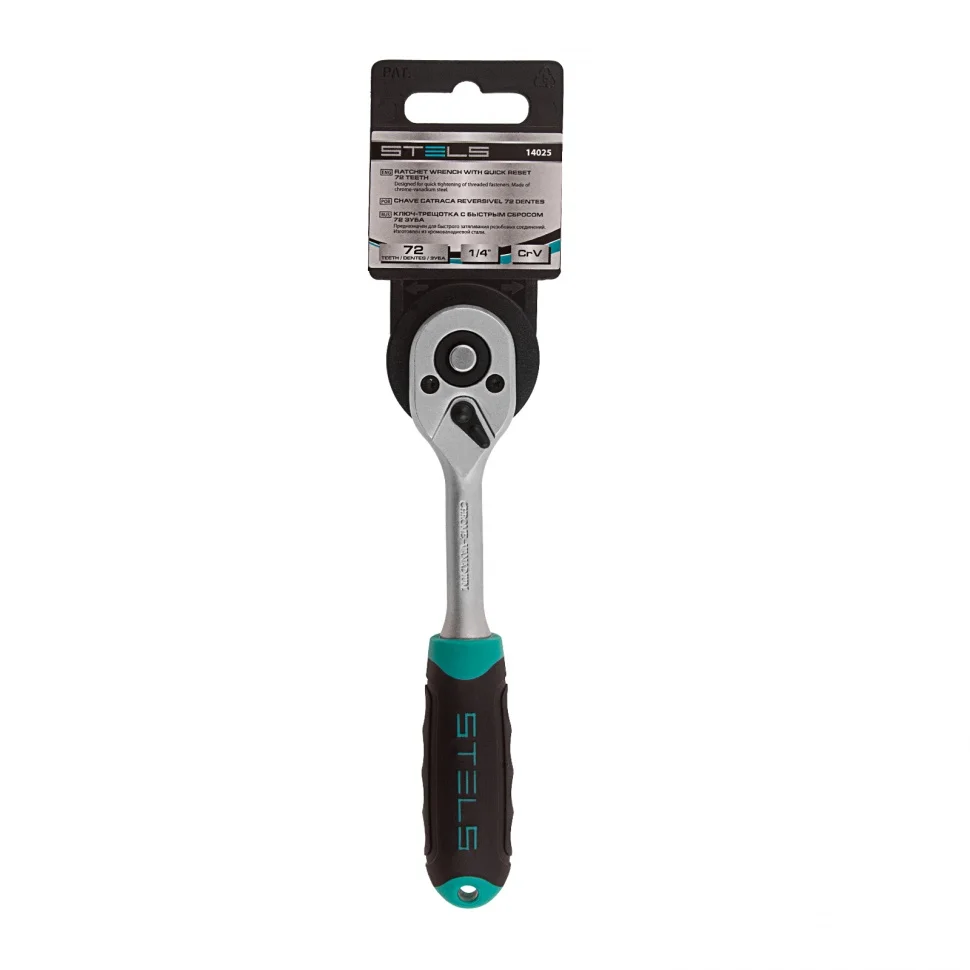 Ключ-трещотка Stels 14025 из стали CrV, с присоединительным квадратом 1/4 дюйма, 72 зубцами и быстрым сбросом предназначен для соединения и демонтажа резьбовых крепежей. Совместим с торцевыми головками различных размеров, а также адаптерами и удлинителями. Инструмент работает мягко и плавно благодаря 72-зубому храповому механизму. Шаг трещотки составляет 5 градусов, что облегчает работу в ограниченном пространстве. Инструмент будет полезен в сервисном центре, авторемонтной мастерской, а также пригодится дома, в гараже или на даче.ПреимуществаКлюч износостоек и выдерживает значительные нагрузки, т.к. изготовлен из высокопрочной стали хромованадиевой группы.Хромовое покрытие защищает от коррозии и продлевает срок службы инструмента.Присоединительный квадрат с шариковым фиксатором крепко удерживает насадку, не давая ей отскочить во время работы.Ключ оснащен механизмом быстрого сброса насадок — это экономит время на их замену.Флажковый переключатель позволяет мгновенно изменить направление вращения насадки.Двухкомпонентная рукоятка не скользит в руке, а ее эргономичная форма уменьшает усталость при длительной работе.