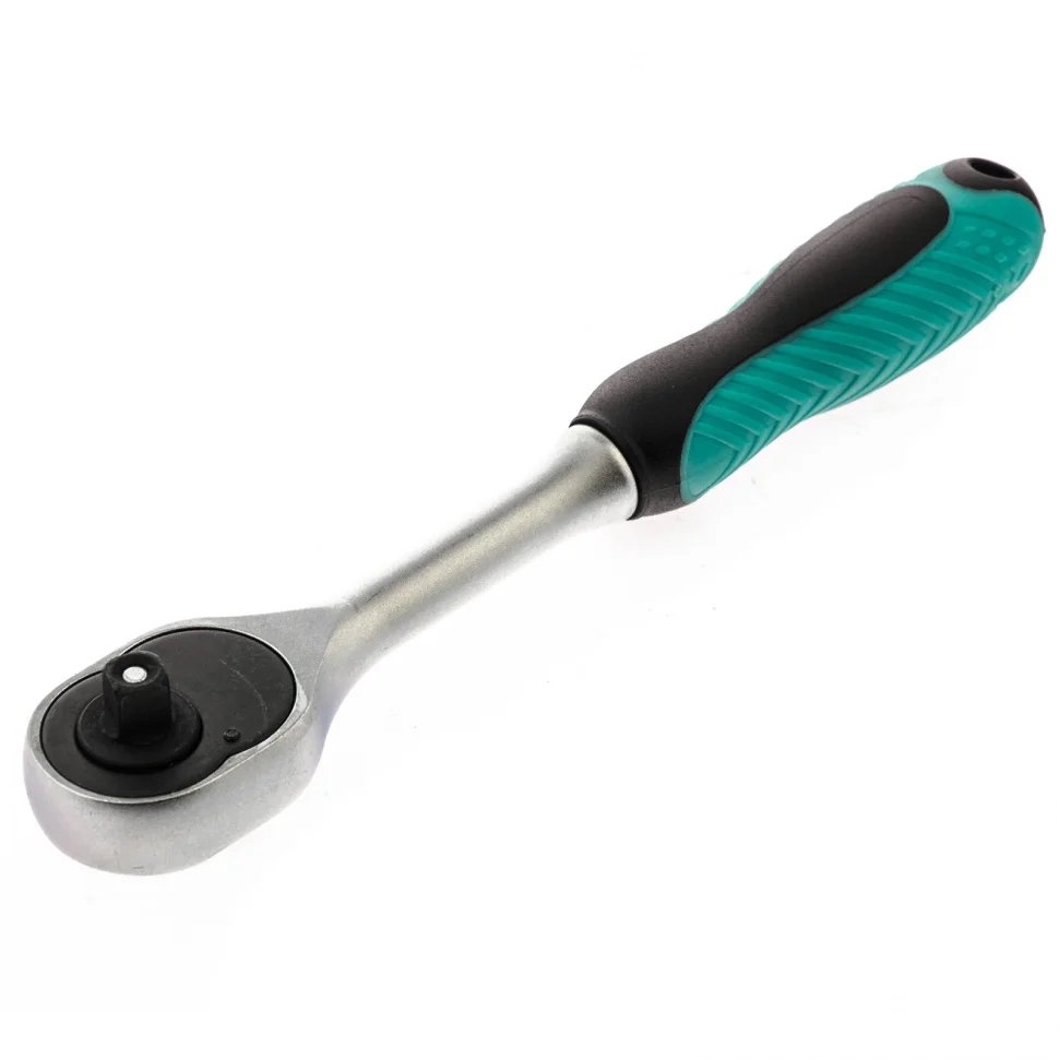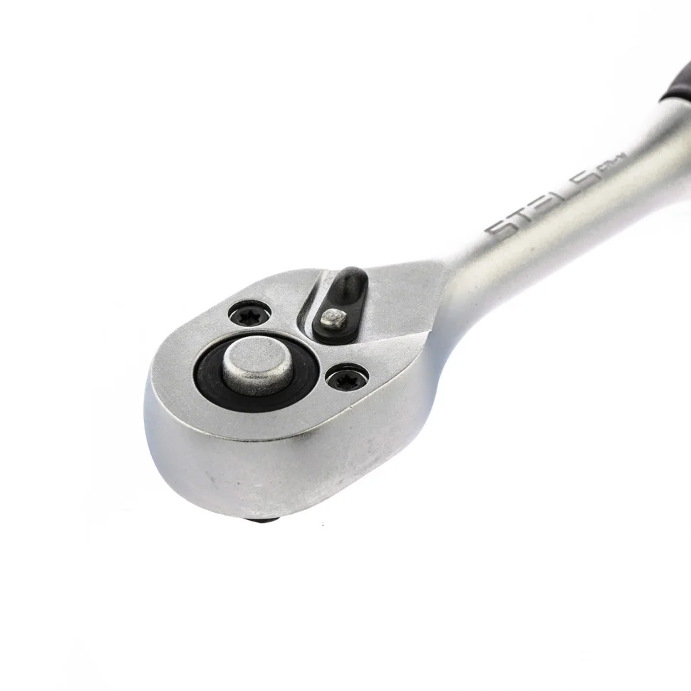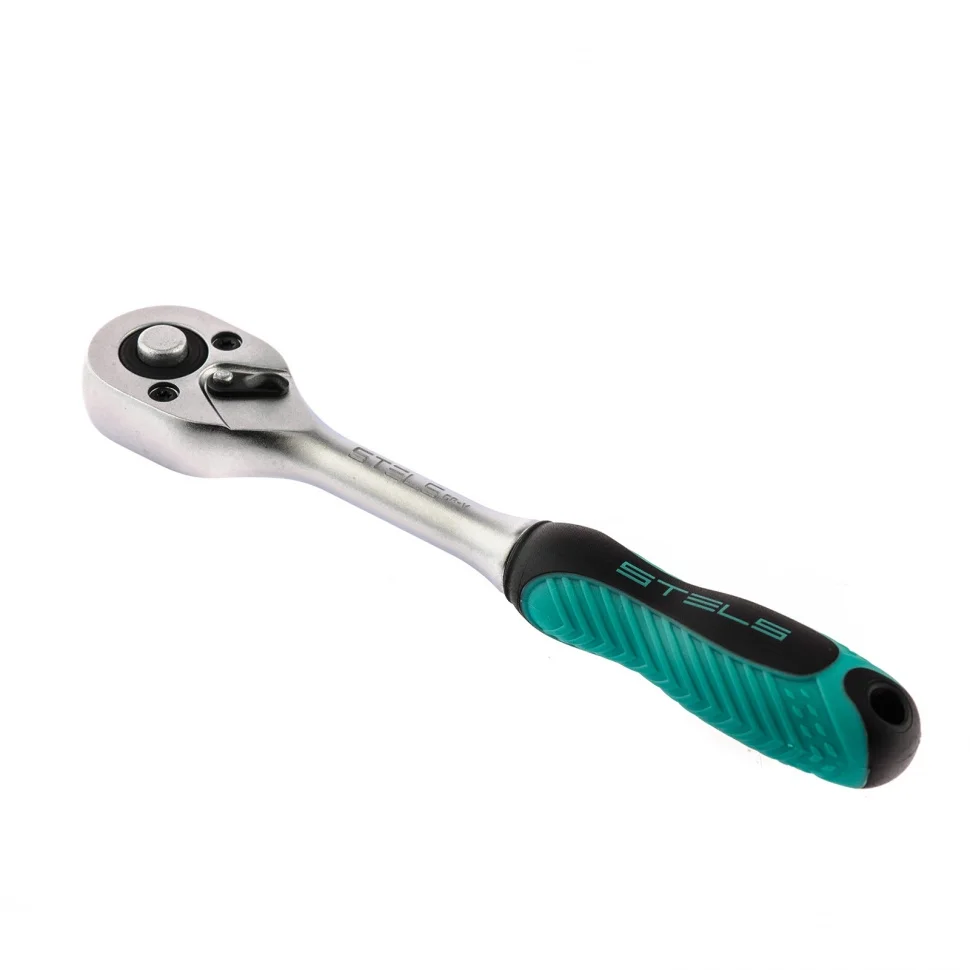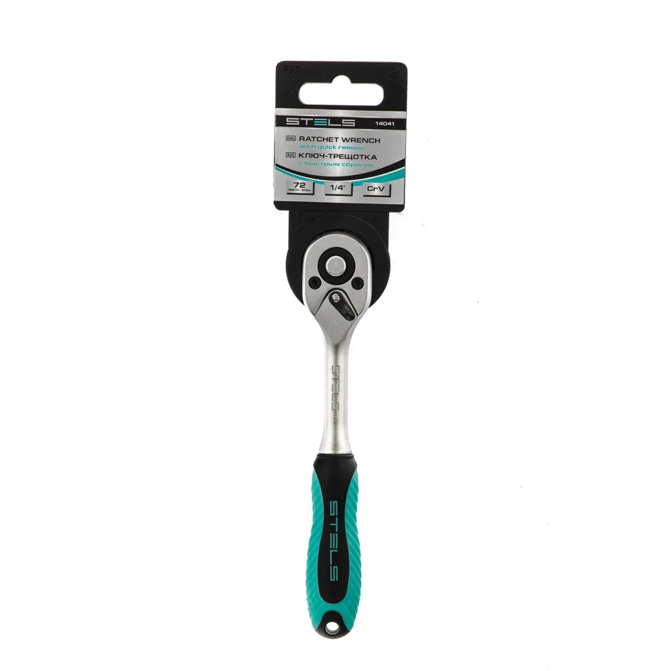 Ключ-трещотка Stels 14041 из стали CrV, с присоединительным квадратом 1/4 дюйма, 72 зубцами и быстрым сбросом предназначен для соединения и демонтажа резьбовых крепежей. Совместим с торцевыми головками различных размеров, а также адаптерами и удлинителями. Инструмент работает мягко и плавно благодаря 72-зубому храповому механизму. Шаг трещотки составляет 5 градусов, что облегчает работу в ограниченном пространстве. Инструмент будет полезен в сервисном центре, авторемонтной мастерской, а также пригодится дома, в гараже или на даче.ПреимуществаКлюч износостоек и выдерживает значительные нагрузки, т.к. изготовлен из высокопрочной стали хромованадиевой группы.Хромовое покрытие защищает от коррозии и продлевает срок службы инструмента.Присоединительный квадрат с шариковым фиксатором крепко удерживает насадку, не давая ей отскочить во время работы.Ключ оснащен механизмом быстрого сброса насадок — это экономит время на их замену.Флажковый переключатель позволяет мгновенно изменить направление вращения насадки.Двухкомпонентная рукоятка с рифленой поверхностью не скользит в руке, а ее эргономичная форма уменьшает усталость при длительной работе.