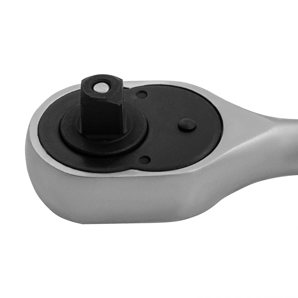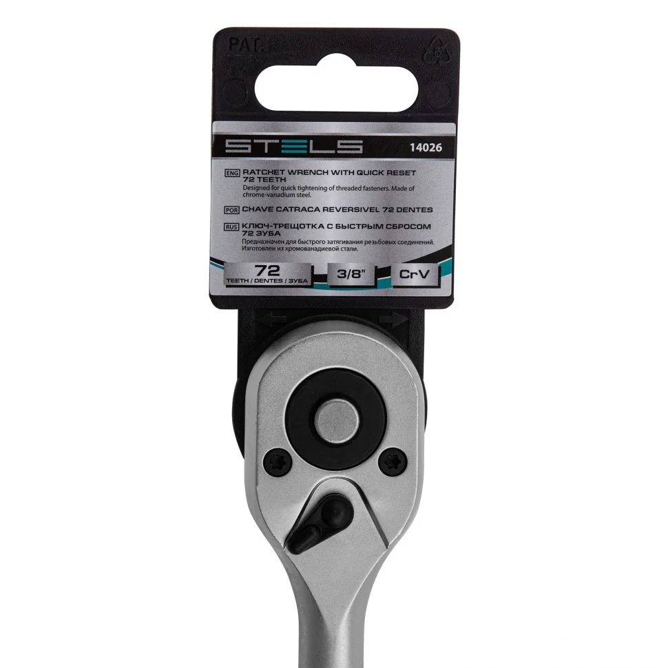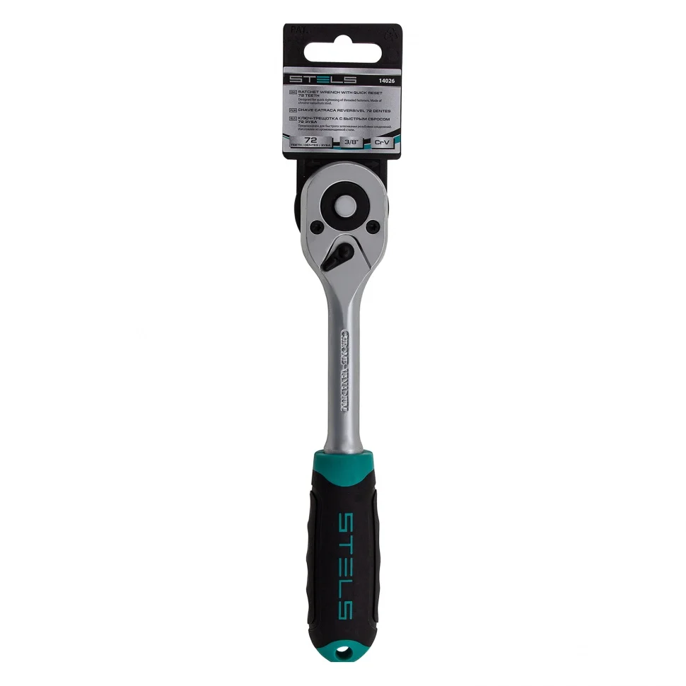 Ключ-трещотка Stels 14026 из стали CrV, с присоединительным квадратом 3/8 дюйма, 72 зубцами и быстрым сбросом предназначен для соединения и демонтажа резьбовых крепежей. Совместим с торцевыми головками различных размеров, а также адаптерами и удлинителями. Инструмент работает мягко и плавно благодаря 72-зубому храповому механизму. Шаг трещотки составляет 5 градусов, что облегчает работу в ограниченном пространстве. Инструмент будет полезен в сервисном центре, авторемонтной мастерской, а также пригодится дома, в гараже или на даче.ПреимуществаКлюч износостоек и выдерживает значительные нагрузки, т.к. изготовлен из высокопрочной стали хромованадиевой группы.Хромовое покрытие защищает от коррозии и продлевает срок службы инструмента.Присоединительный квадрат с шариковым фиксатором крепко удерживает насадку, не давая ей отскочить во время работы.Ключ оснащен механизмом быстрого сброса насадок — это экономит время на их замену.Флажковый переключатель позволяет мгновенно изменить направление вращения насадки.Двухкомпонентная рукоятка не скользит в руке, а ее эргономичная форма уменьшает усталость при длительной работе.