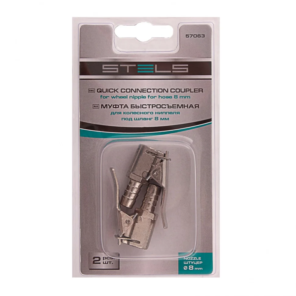 Быстросъемная муфта Stels 57063 со штуцером «елка», 2 шт. в упаковке, предназначена для быстрого соединения шланга диаметром 8 мм с колесным ниппелем для подкачки шин. Пригодится в поездке и в гараже.ПреимуществаВысокий ресурс — муфта выполнена из прочного цинкового сплава.Надежная фиксация — соединение «елочка» обеспечивает герметичное подключение шланга.Продуманная комплектация — в наборе 2 штуки, можно накачивать 2 колеса одновременно или оставить муфту про запас.
