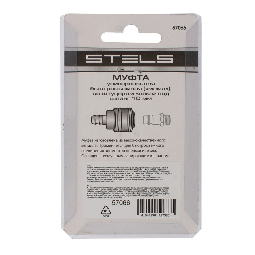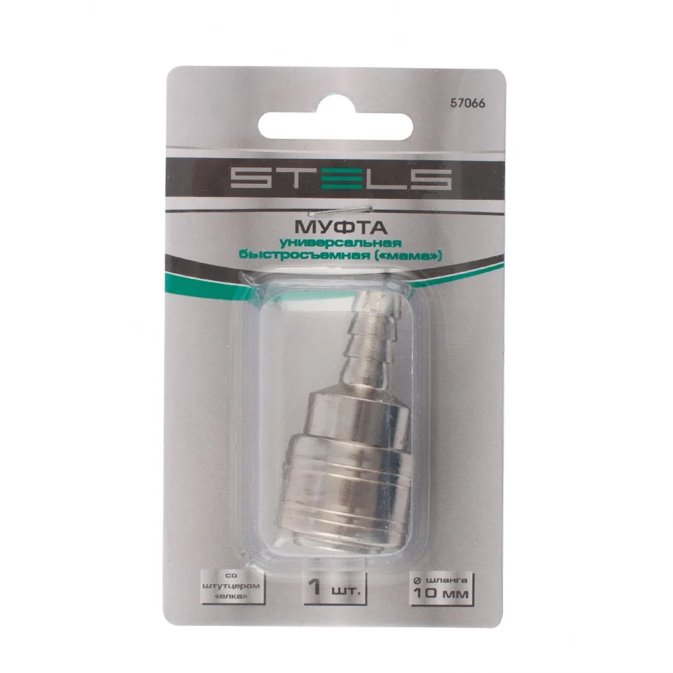 Универсальная муфта Stels 57066 со штуцером «елка» и быстросъемным соединением «мама», 1 шт. в упаковке, обеспечивает быстрое подключение шлангов диаметром 10 мм к компрессору. Используется для монтажа пневмолиний и работы с пневмоинструментом.ПреимуществаПрочность и долговечность — стальная муфта выдерживает высокие нагрузки.Легкий монтаж — благодаря быстроразъемному соединению муфта подключается одним движением.Удобный блистер — изделие можно осмотреть перед покупкой.
