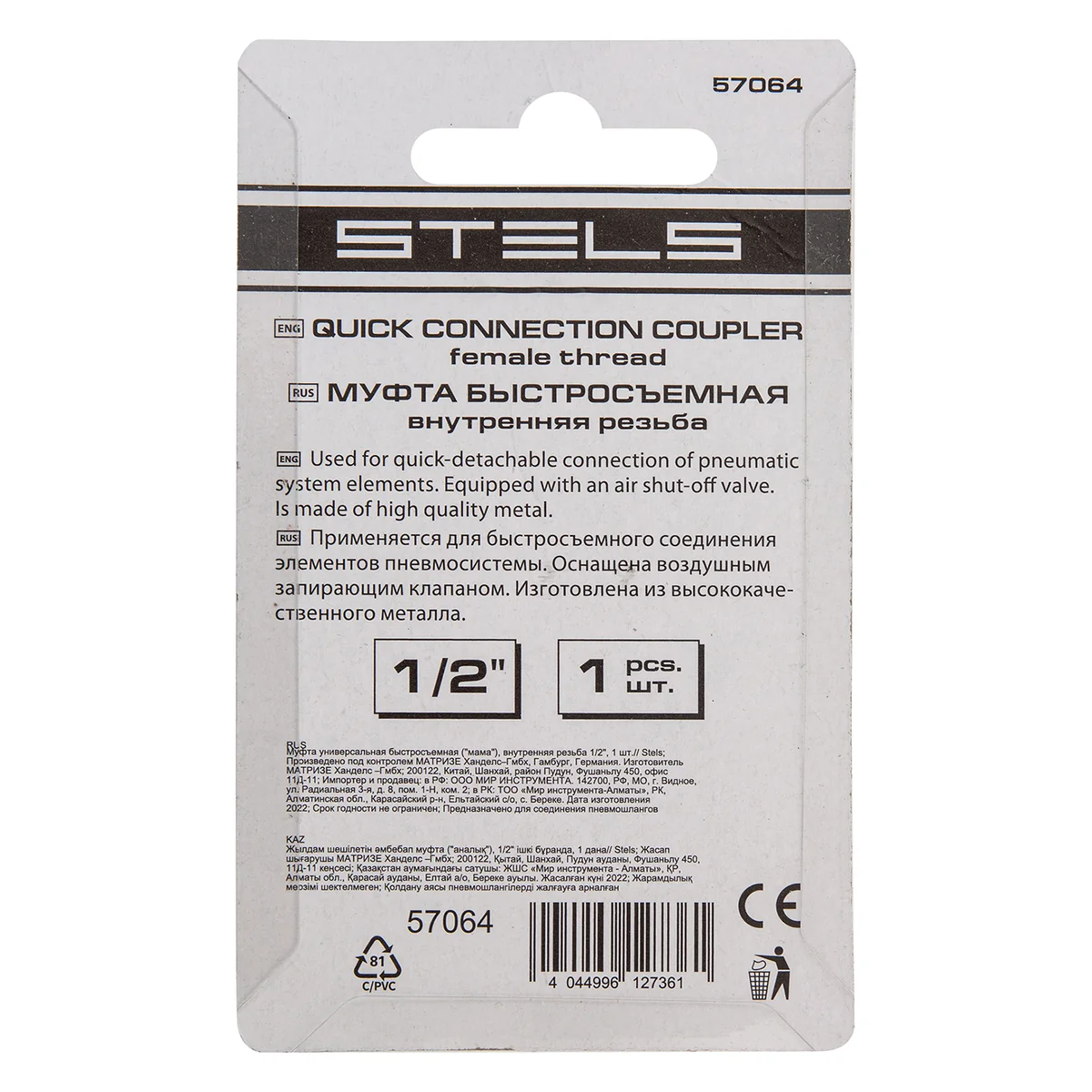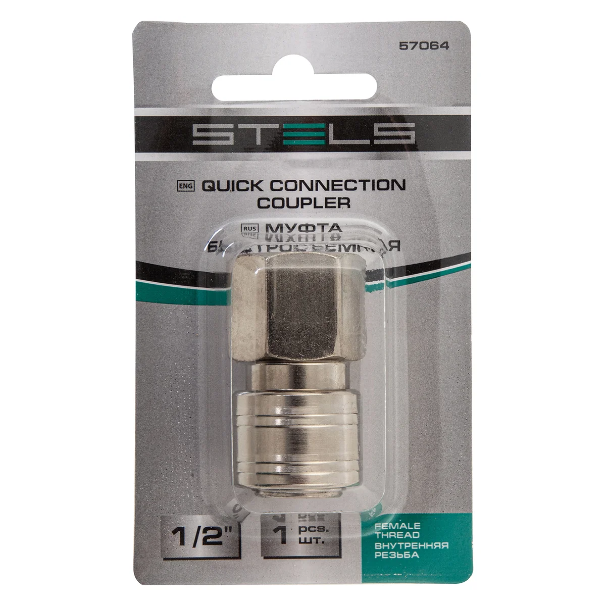 Универсальная муфта Stels 57064 с внутренней резьбой 1/2 дюйма, 1 шт. в упаковке, рассчитана на присоединение шланга пневмоинструмента к компрессору с быстросъемным рапидом «мама». Пригодится во время строительства, ремонта, также будет полезна в автосервисе и гараже.ПреимуществаВысокий ресурс и устойчивость к коррозии — муфта изготовлена из стали.Простое использование — быстросъемное соединение муфты позволяет подключить пневмосистему без дополнительного инструмента.Удобная упаковка — муфта поставляется в блистере, позволяющем осмотреть изделие перед покупкой.