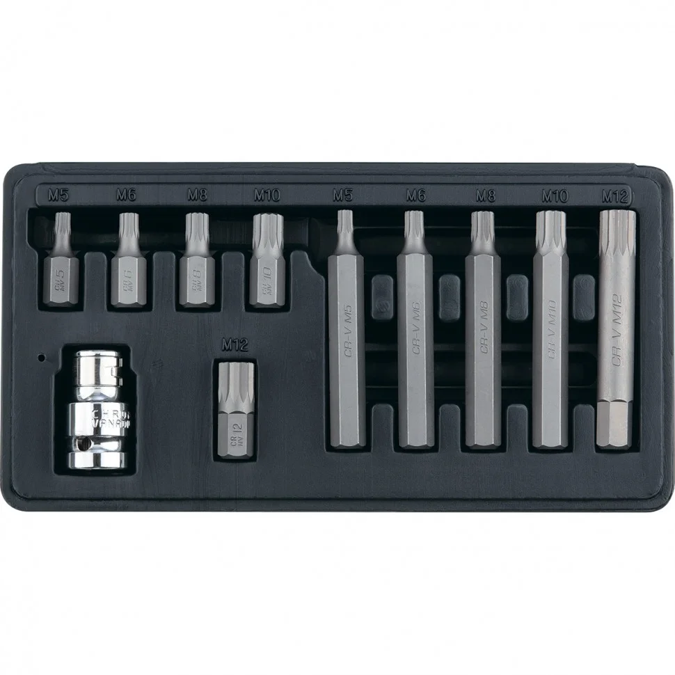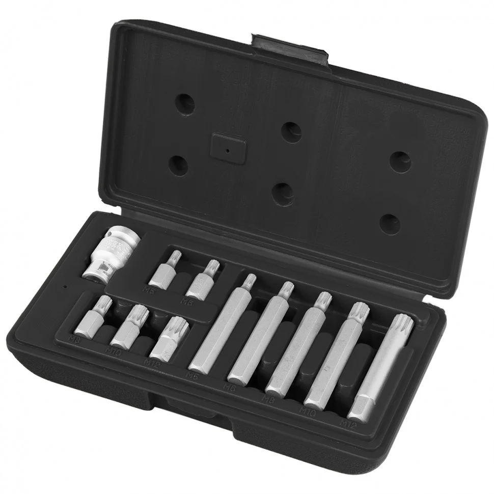 Набор Stels 11312 включает 11 предметов: 10 бит SPLINE из стали CrV, с шестигранным хвостовиком 1/2 дюйма, и переходник. Биты со шлицами в виде 12-лучевых «звезд» используются для монтажа и демонтажа резьбовых соединений с головками SPLINE М5, М6, М8, М10 и М12. Набор будет полезен в автомобильном производстве, на станции техобслуживания, в гараже для выполнения работ, требующих максимального усилия затяжки.