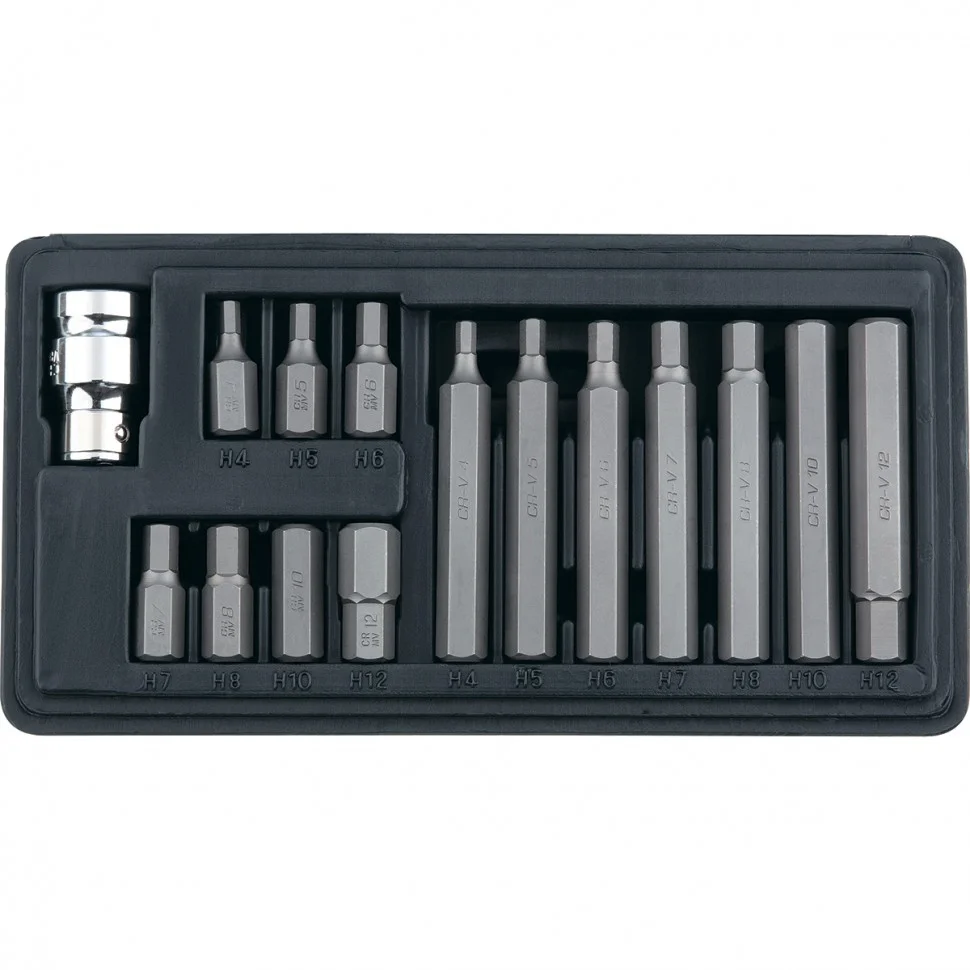 Набор бит Stels HEX с шестигранным хвостовиком 1/2'' арт. 11313 включает 15 предметов: 7 насадок 35 мм, 7 насадок 75 мм и переходник. Они используются с переходником и ключом-трещоткой, либо с переходником и пневмотрещоткой, пневмогайковертом при монтаже и демонтаже евровинтов со шлицами HEX H4-H12. Набор предназначен для использования в автомастерских и на производстве автомобилей.ПреимуществаБиты из хромованадиевой стали твердостью 50-53 HRC отличаются повышенной износостойкостью, поэтому прослужат долго.Переходник позволяет устанавливать биты 1/2" на инструменты с посадочным размером 3/8".Удобная система хранения и транспортировки — биты поставляются в кейсе с ложементами с указанием размера.