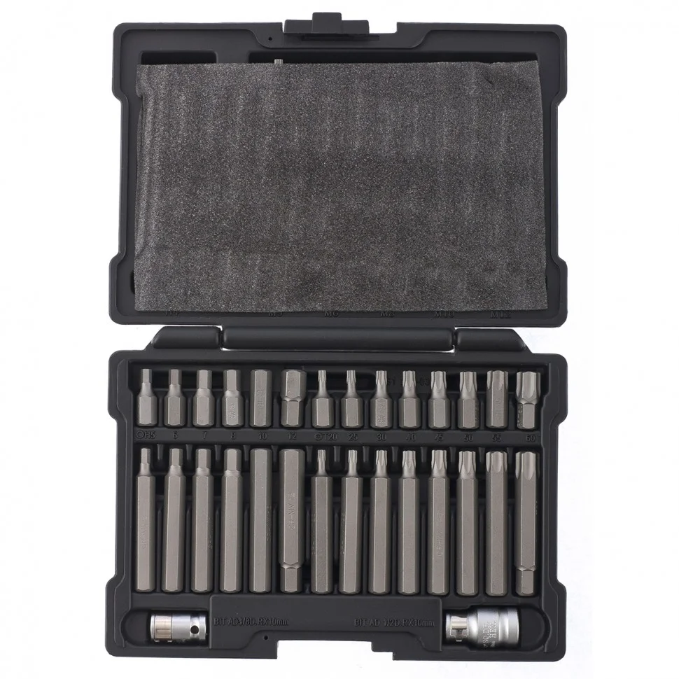 Набор бит Stels HEX, TORX, SPLINE с шестигранным хвостовиком 1/2" арт. 11318 предназначен для использования с ключом-трещоткой, пневмотрещоткой или пневматическим гайковертом. Комплект оптимален для крепления саморезов, винтов, шурупов следующих типов: 6-гранных HEX, «звезд» TORX и 12-лучевых SPLINE. Он необходим для профессионального применения в автомастерских и на производствах автомобилей. Универсальный набор состоит из 40 насадок длиной 35 мм и 75 мм, а также двух переходников 1/2"-3/8" и 3/8"-3/8".ПреимуществаБиты из хромованадиевой стали твердостью 50-53 HRC отличаются повышенной износостойкостью, поэтому прослужат долго.Переходники позволяют устанавливать биты 1/2" на инструменты с посадочным размером 3/8".Удобная система хранения и транспортировки — биты поставляются в кейсе с ложементами с указанием размера.