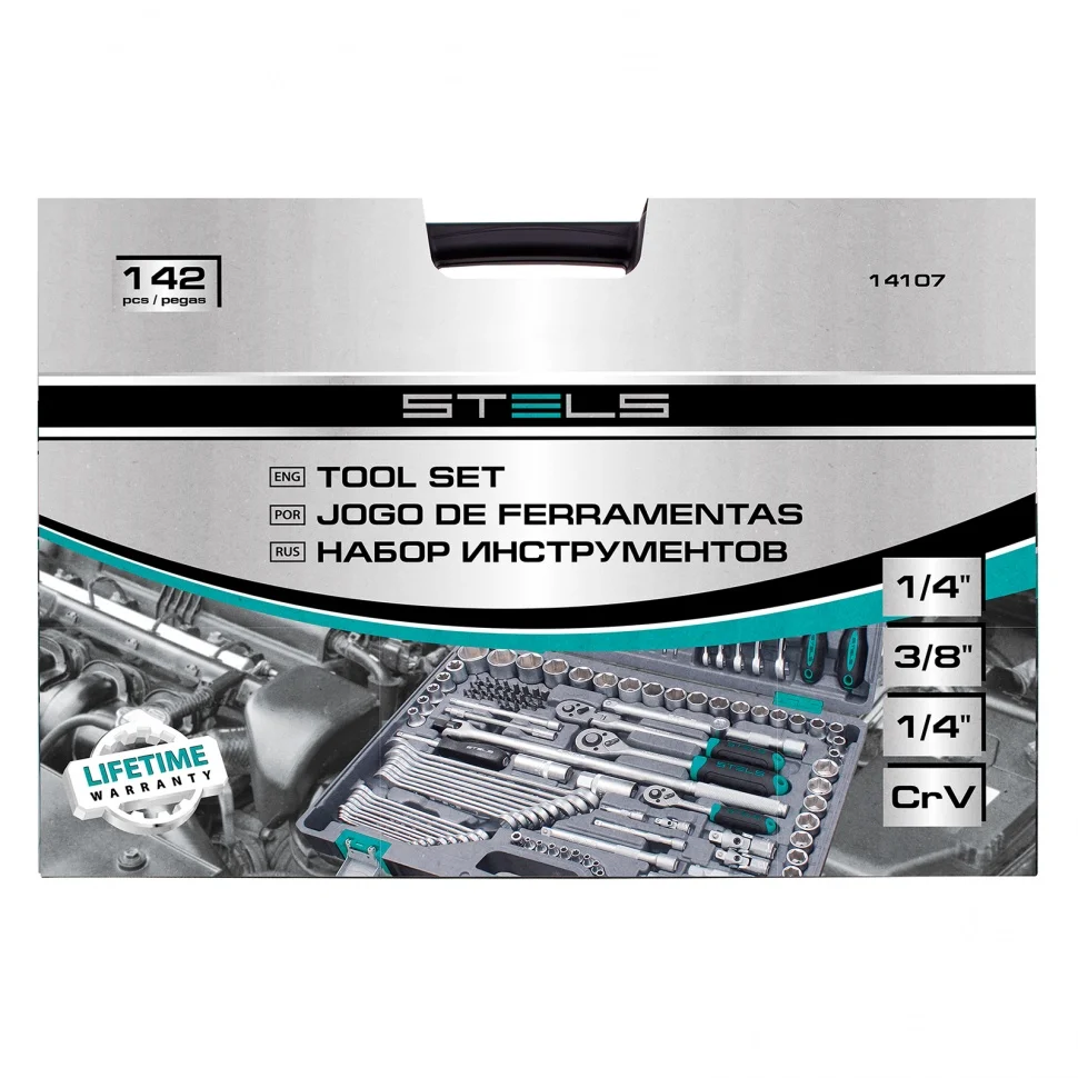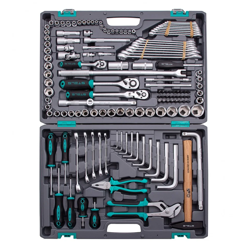 Набор инструментов Stels 14107 в пластиковом кейсе включает 142 предмета из стали CrV, с присоединительными размерами 1/2", 1/4" и 3/8", и предназначен для ремонта автомобилей в гараже или автосервисе. Может использоваться в домашних условиях. В комплект входят инструменты для выполнения широкого спектра слесарных работ. Набор упакован в ударопрочный кейс из жесткого пластика и с металлическими застежками, поэтому его удобно хранить и перевозить в багажнике автомашины.
