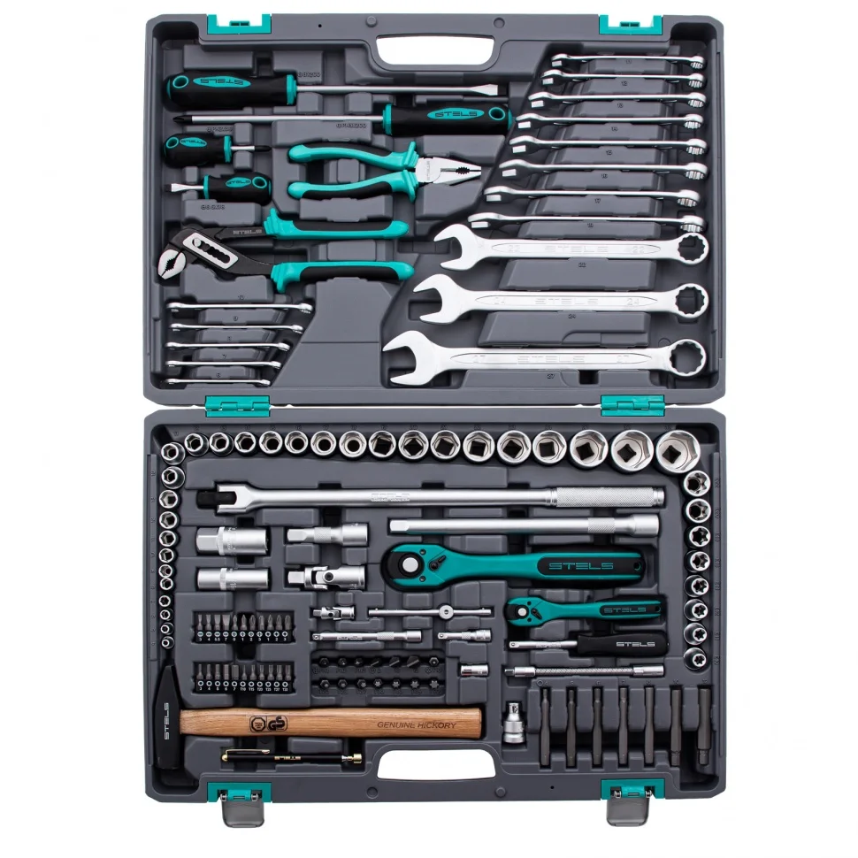 Набор инструментов Stels 14112 в усиленном кейсе включает в себя 119 предметов из стали CrV и S2, с присоединительными размерами 1/2" и 1/4". С его помощью можно проводить различные слесарно-монтажные работы — кроме инструментов для закручивания и откручивания крепежей в комплект входят молоток, переставные клещи и пассатижи. Набор предназначен для автолюбителей и сотрудников автосервисов, пригодится также во время ремонта.