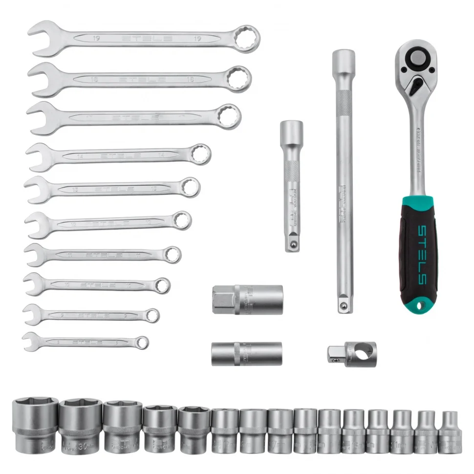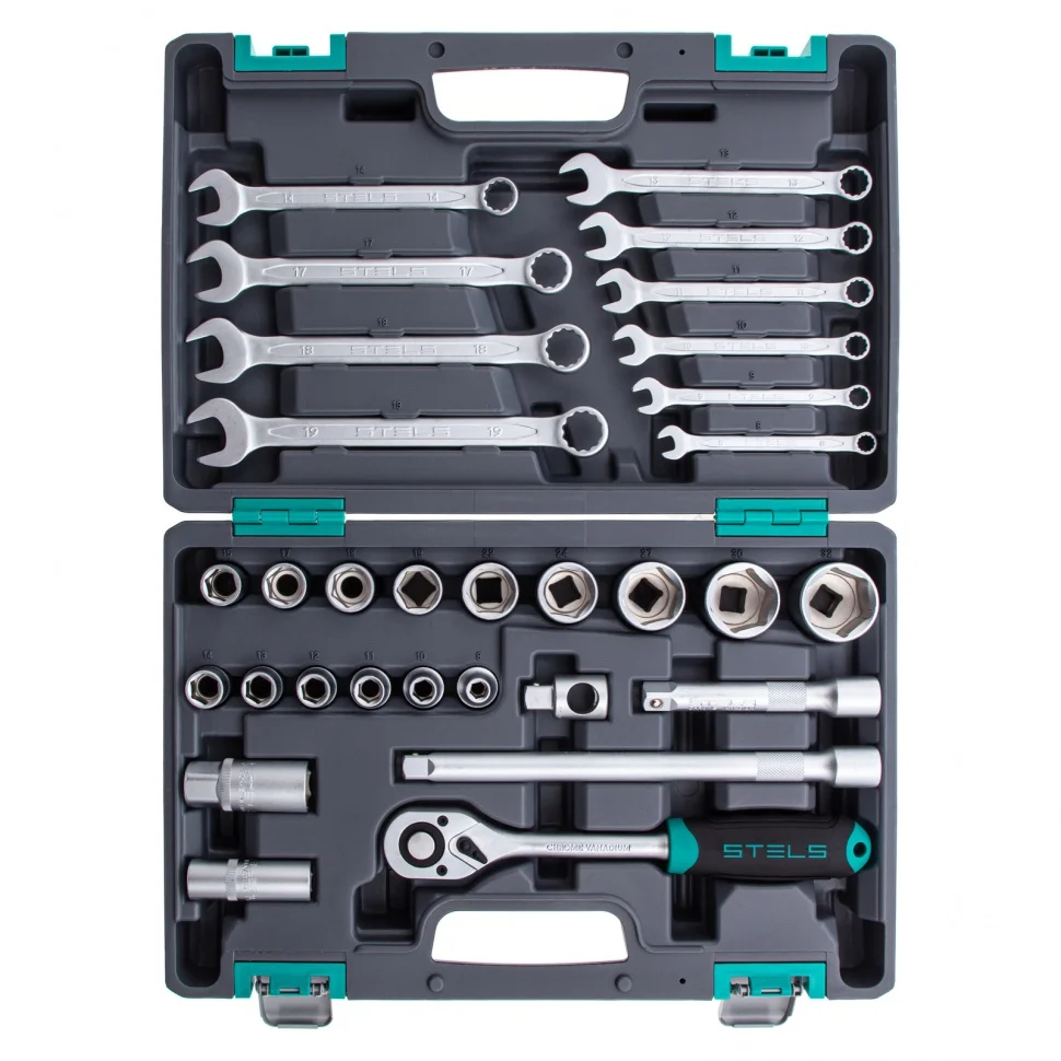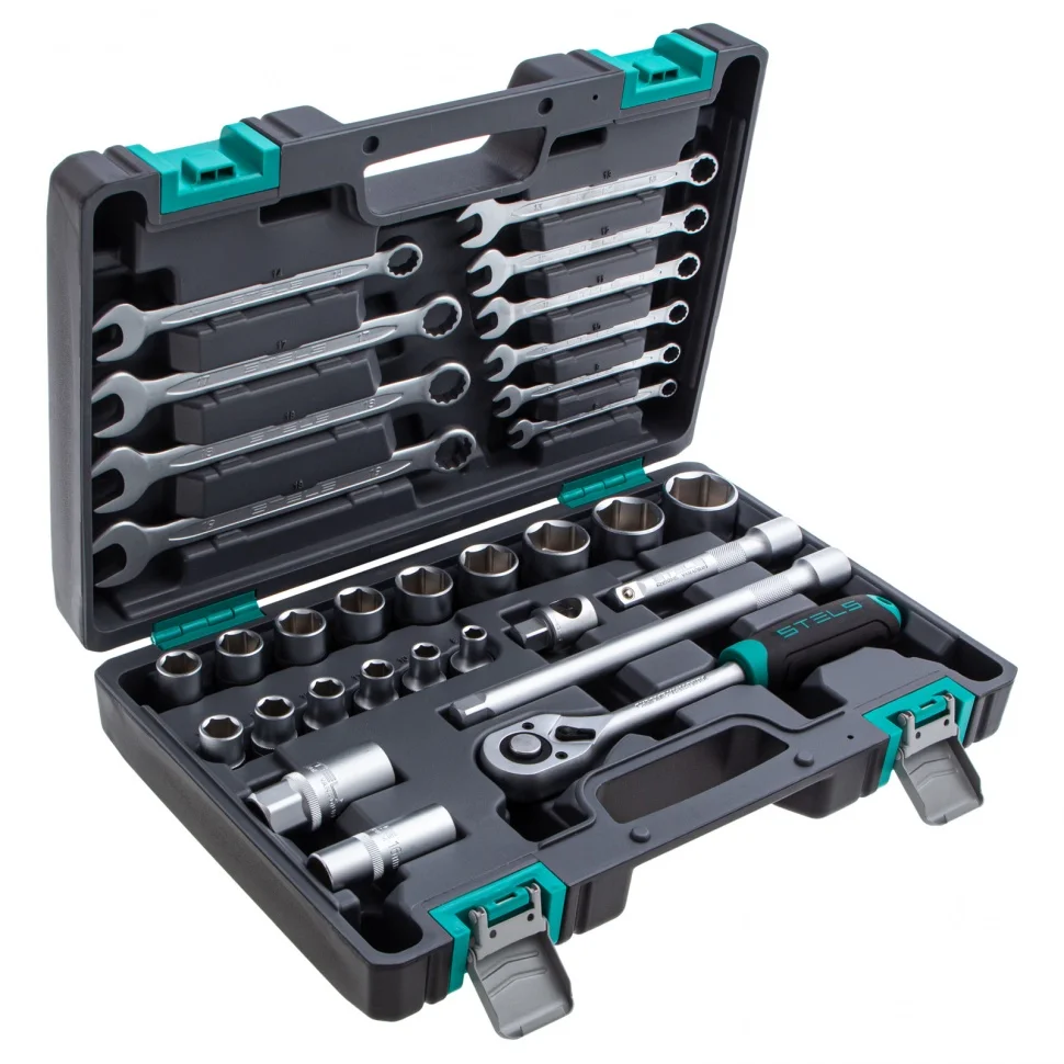 Набор инструментов Stels 14102, 1/2 дюйма, сталь CrV-группы, упакован в пластиковый кейс и состоит из 31 предмета для работы с гайками, винтами и другими резьбовыми крепежами. В комплект входит ключ-трещотка с шагом 5 градусов и удлинители, облегчающие работу в труднодоступных местах. Набор будет полезен в гараже или в поездке, а также пригодится для проведения мелкого ремонта дома или на даче.