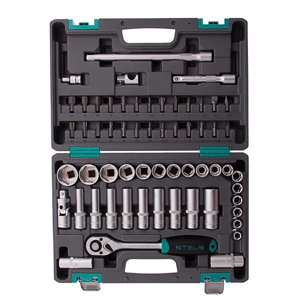 Набор инструментов Stels 14103 в пластиковом кейсе включает в себя 60 предметов с присоединительным размером 1/2 дюйма из стали CrV. Он применяется для монтажа и демонтажа резьбовых соединений во время обслуживания и ремонта авто, а также выполнения бытовых работ. Инструменты пригодятся автолюбителям и домашним мастерам.