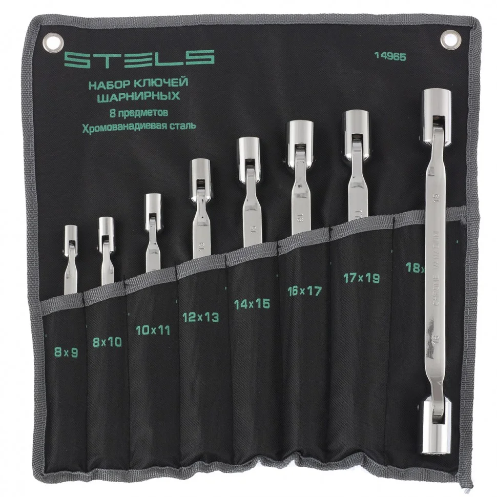 Набор шарнирных ключей Stels 14965 из стали CrV состоит из 8 шт. и предназначен для работы с болтовыми и гаечными соединениями. Включает ключи с головками размером от 8 до 19 мм с 12-гранными профилями. Они обеспечивают плотный обхват крепежа и удобны для работы в стесненных условиях — величина хода составляет всего 30 градусов. Ключи используются для ремонта автомобилей и других слесарно-монтажных работ.ПреимуществаШарнирное крепление головок позволяет передавать крутящий момент под углом, что облегчает работу в труднодоступных местах.Ключи изготовлены из стали хромованадиевой группы, что гарантирует их высокую прочность.Твердость рабочих частей составляет 50 HRC, поэтому инструменты износостойки и долговечны.Поверхность ключей хромирована, поэтому они защищены от коррозии и механических повреждений.Зеркальное покрытие облегчает уход за инструментами — достаточно просто протереть их после окончания работы.