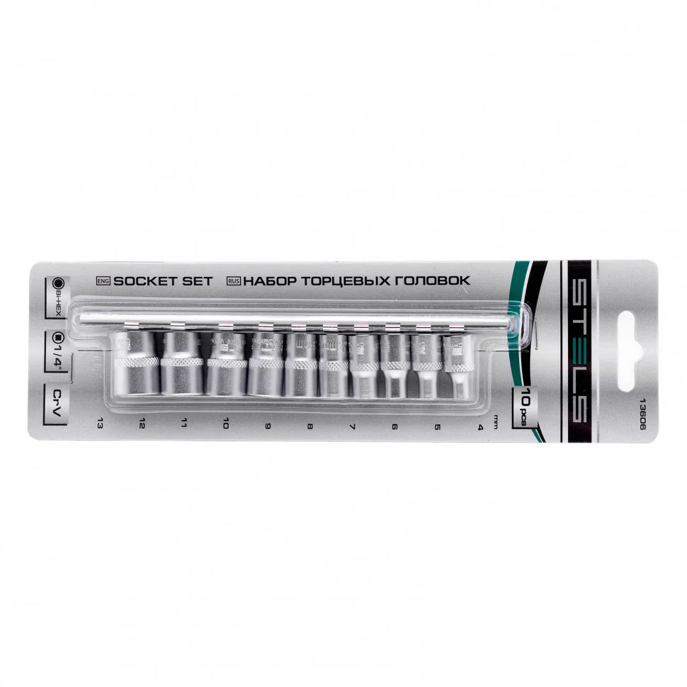 Набор торцевых головок Stels 13606 содержит 10 12-гранных насадок 4-13 мм из стали CrV, с посадочным размером 1/4 дюйма. Торцевые головки используются с трещотками, воротками и гайковертами для откручивания и закручивания гаек, болтов и других крепежных элементов. Насадки выдерживают интенсивные нагрузки, поэтому набор незаменим для техобслуживания авто и ремонтных работ дома и на даче.ПреимуществаПрочность и высокий ресурс — головки выполнены из стали хромованадиевой группы.Аккуратная работа — 12-гранный зев обеспечивает увеличенную площадь контакта с крепежом, что снижает риск его деформации при высоких нагрузках.Удобная работа в ограниченном пространстве — за счет 12-гранного зева головки позволяют вращать крепеж с меньшим углом поворота (30 градусов), чем модели с 6-гранным зевом.Защита от коррозии — на головки нанесено матовое хромоникелевое покрытие.Удобное хранение — в комплект входит металлическая плашка-держатель.
