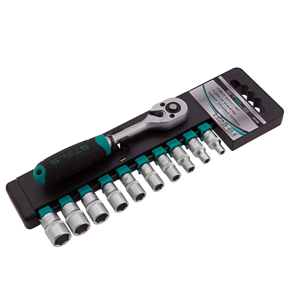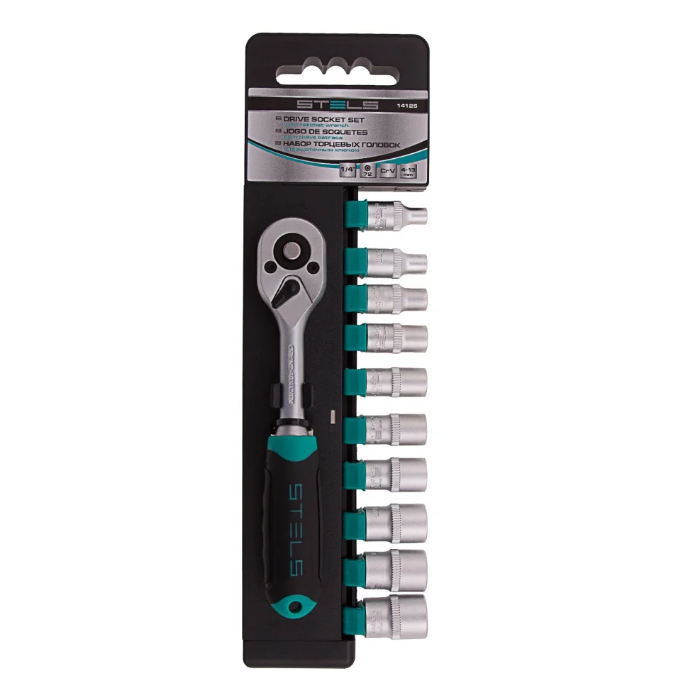 Набор Stels 14125 из стали CrV включает в себя 11 предметов: торцевые головки 4-13 мм с присоединительным размером 1/4 дюйма и трещоточный ключ. Он используется для закручивания и откручивания крепежных элементов, пригодится при ремонте крупногабаритной техники и обслуживании авто. Инструменты выдерживают высокие нагрузки и могут использоваться в ограниченном пространстве.ПреимуществаВысокий ресурс — корпус трещотки и головок изготовлен из хромованадиевой стали.Защита от коррозии — на металлические части нанесено матовое хромоникелевое покрытие.Плавное вращение — трещотка с 72 зубьями удобна для работы в труднодоступных местах.Механизм быстрого сброса — можно легко менять насадки для переключения между задачами.Надежная фиксация оснастки — присоединительный квадрат трещотки оснащен шариковым держателем.Комфортная работа — двухкомпонентная эргономичная рукоятка надежно лежит в руке.Удобное хранение — набор поставляется с компактным пластиковым держателем.