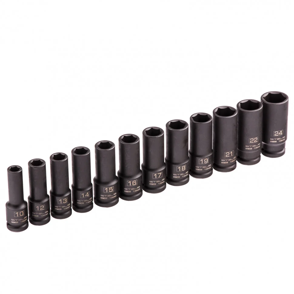 Набор ударных глубоких шестигранных торцевых головок Stels 13998 включает в себя 12 насадок размером 10-24 мм с присоединительным квадратом 1/2 дюйма. Ударные головки устанавливаются на гайковерт и выдерживают высокие динамические нагрузки, поэтому подходят для проведения строительных работ и обслуживания автомобилей.ПреимуществаУдлиненный профиль — головки удобны для работы в труднодоступных местах и для монтажа метизов на шпильках.Повышенная износостойкость — головки изготовлены из хромомолибденовой стали, твердость рабочих частей составляет 44-48 HRC.Защита от разрушения — матовое фосфатное покрытие предотвращает образование коррозии.Удобство хранения и транспортировки — набор поставляется в прочном кейсе.