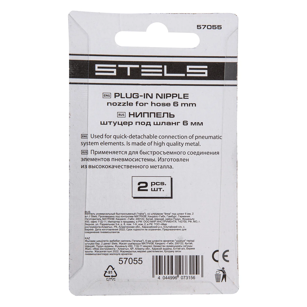 Универсальный быстросъемный ниппель Stels 57055 служит переходником для подключения пневмоинструмента к магистрали сжатого воздуха. Соединение осуществляется быстро и не требует от пользователя усилий.Преимущества:Ниппель обеспечивает герметичную стыковку элементов пневмомагистрали, что защищает от потери производительности.Стальная конструкция рассчитана на долгую службу.Никелевое покрытие надежно защищает ниппель от коррозии.В комплект поставки входит 2 ниппеля.