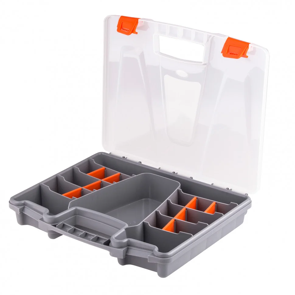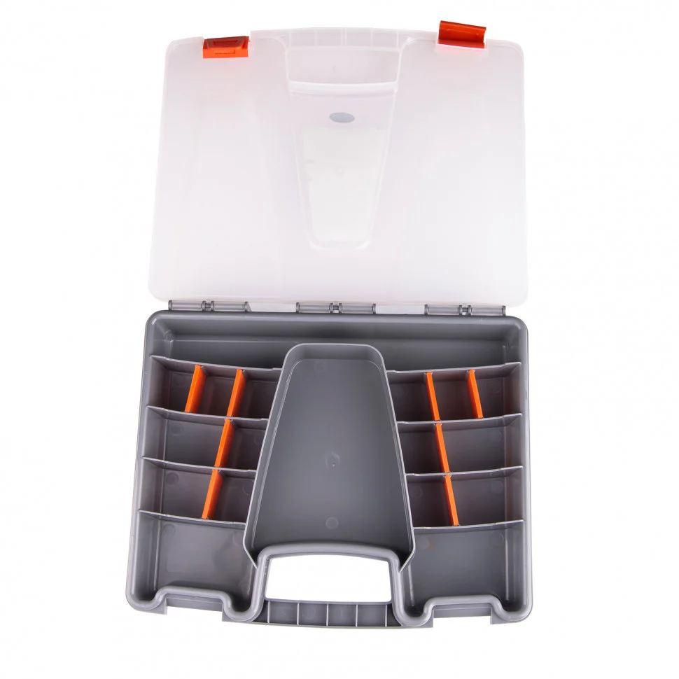 Органайзер из пластика Stels 90707 размером 310 х 250 х 50 мм позволяет обустроить практичное место хранения мелких деталей. Также его удобно брать с собой на выездные работы. Органайзер помогает поддерживать порядок в мастерской и предотвращает потерю деталей.ПреимуществаПолипропиленовый корпус гарантирует защиту содержимого от влаги и пыли.Размер секций можно регулировать, это обеспечивает возможность хранения различных деталей.Органайзер оснащен ручкой и защелками для удобства и безопасности транспортировки.