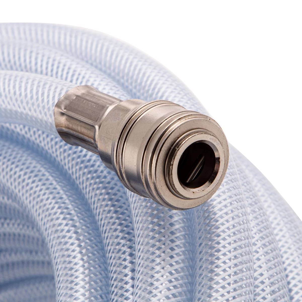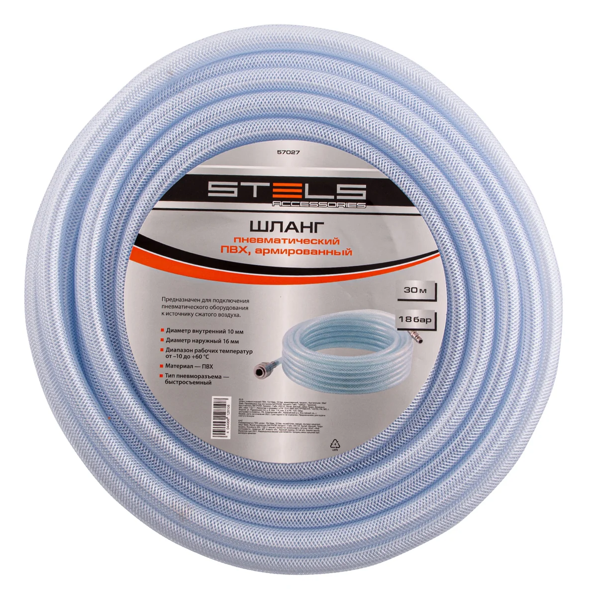 Армированный прозрачный пневматический шланг Stels 57027 из ПВХ, 10 х 16 мм, длиной 30 м, с быстросъемами, выдерживает давление до 18 бар и предназначен для соединения между собой мощных компрессоров и инструментов с пневматическим приводом, а также прокладки магистральной пневмолинии. Изготовлен из ПВХ и имеет армирующий слой из полиамида, поэтому характеризуется высокой прочностью и устойчивостью к падениям и пережатиям, а также невосприимчивостью к химическим воздействиям. Шланг подойдет для использования на производственном предприятии, строительной площадке или в автосервисе.ПреимуществаШланг можно быстро подключить к компрессору и пневматическим инструментам благодаря быстросъемным соединениям типа рапид.Штуцер и муфта прослужат долго, поскольку изготовлены из прочной углеродистой стали и защищены от коррозии никелевым покрытием.Длины 30 м достаточно для беспрепятственного перемещения мастера по рабочему пространству.Увеличенная толщина шланга повышает его износостойкость и продлевает срок службы.