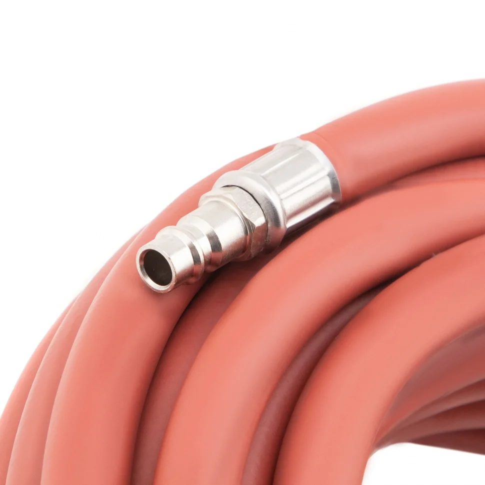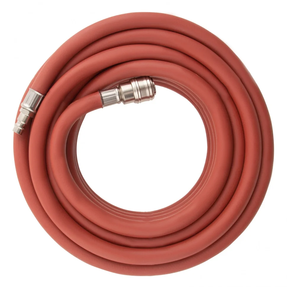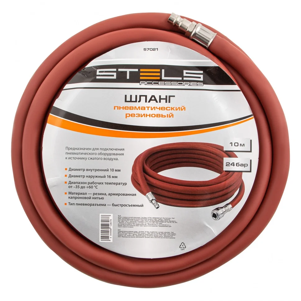 Пневматический армированный резиновый шланг Stels 57021, 10 х 16 мм, длиной 10 м, с быстросъемами, служит для подключения пневматического оборудования к компрессору и выдерживает давление до 24 бар. Изготовлен из резины и армирован капроновой нитью, что обеспечивает высокую устойчивость к механическому воздействию и пережатию, а также к перепадам температур. Может использоваться для прокладки воздушной магистрали. Шланг пригодится на производстве, строительной площадке и в автосервисе.ПреимуществаБыстросъемные соединения типа рапид облегчают подключение шланга к компрессору и пневматическим инструментам.Антикоррозийное никелевое покрытие защищает штуцер и муфту от ржавчины, что увеличивает срок их службы.Длина 10 м обеспечивает мастеру свободное перемещение во время работы.Увеличенная толщина шланга придает ему повышенную прочность.