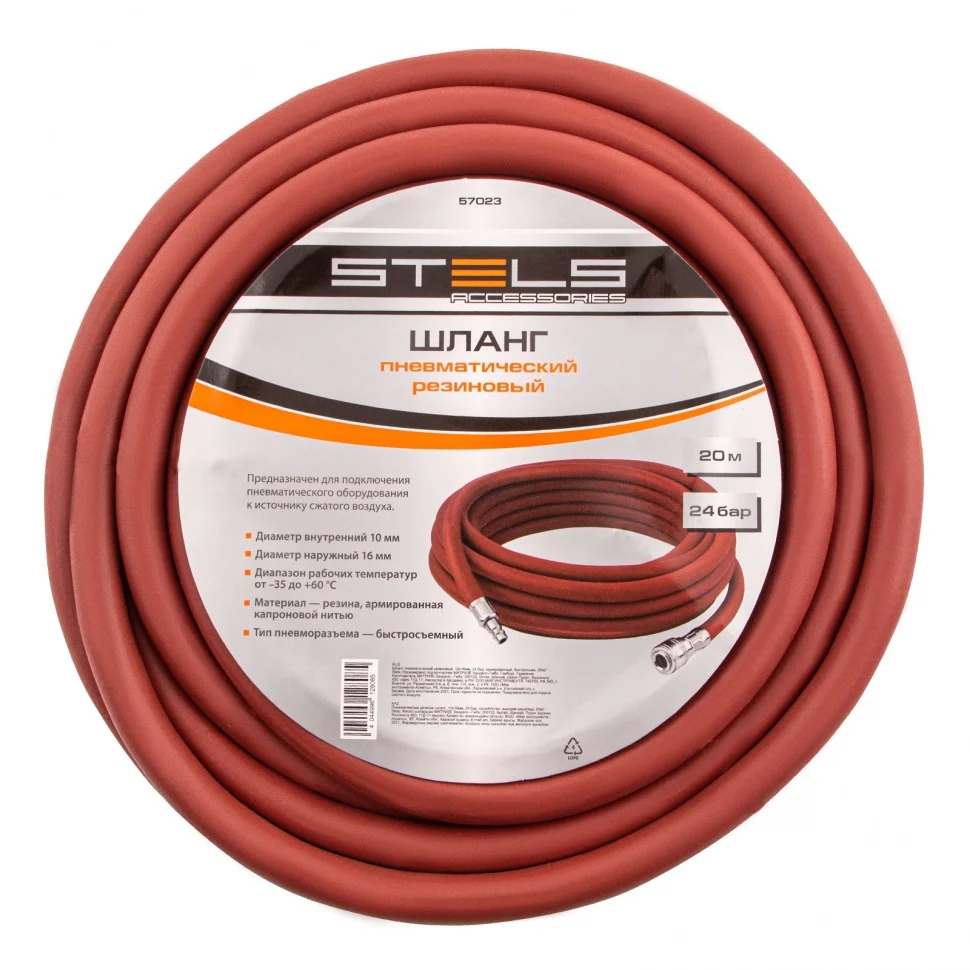 Пневматический армированный резиновый шланг Stels 57023, 10 х 16 мм, длиной 20 м, с быстросъемами, служит для подключения пневматического оборудования к компрессору и выдерживает давление до 24 бар. Изготовлен из резины и армирован капроновой нитью, что обеспечивает высокую устойчивость к механическому воздействию и пережатию, а также к перепадам температур. Может использоваться для прокладки воздушной магистрали. Шланг пригодится на производстве, строительной площадке и в автосервисе.ПреимуществаБыстросъемные соединения типа рапид облегчают подключение шланга к компрессору и пневматическим инструментам.Антикоррозийное никелевое покрытие защищает штуцер и муфту от ржавчины, что увеличивает срок их службы.Длина 20 м обеспечивает мастеру свободное перемещение во время работы.Увеличенная толщина шланга придает ему повышенную прочность.