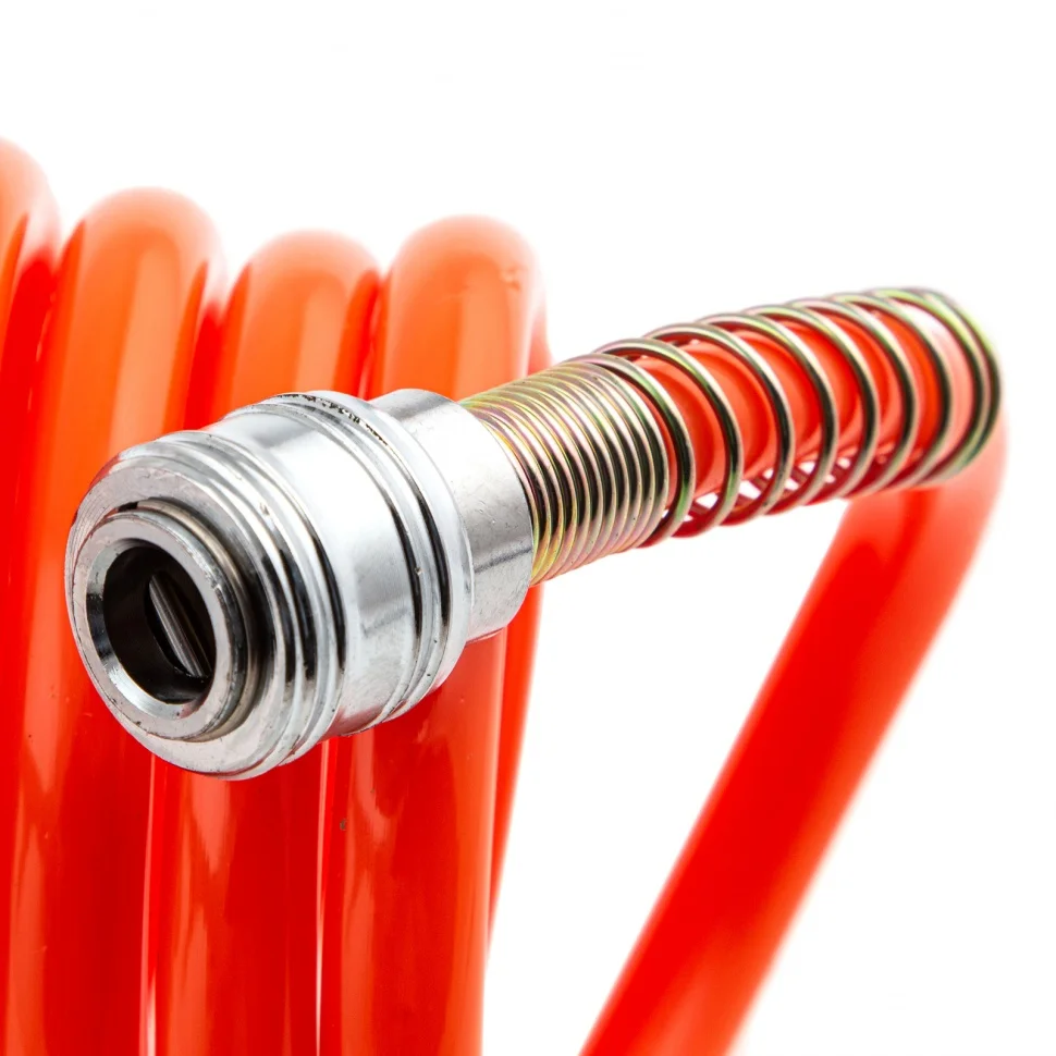 Спиральный воздушный шланг Stels 57019, 8 х 12 мм, длиной 15 м, с быстросъемными соединениями, выдерживает давление до 18 бар и предназначен для подключения пневматических инструментов к источнику сжатого воздуха. Полиэтилен, из которого изготовлен рукав, характеризуется легкостью и устойчивостью к воздействию агрессивных сред, поэтому шланг не боится контактов со строительными смесями, маслом, бензином, а работа с ним не вызывает усталости. Пригодится во время строительства, ремонтно-отделочных работ, а также будет полезен в мастерской или гараже.ПреимуществаСпиральная форма — шланг удобен в хранении, а во время работы не мешает передвижению.Длина 15 м — мастеру не обязательно располагаться рядом с компрессором.Быстросъемные соединения рапид — удобно для быстрого подключения рукава к компрессору и работы поочередно с несколькими пневмоинструментами.Антикоррозийное покрытие — штуцер и муфта устойчивы к ржавчине и служат долго.Увеличенная толщина — рукав выдерживает механические воздействия и перепады давления.