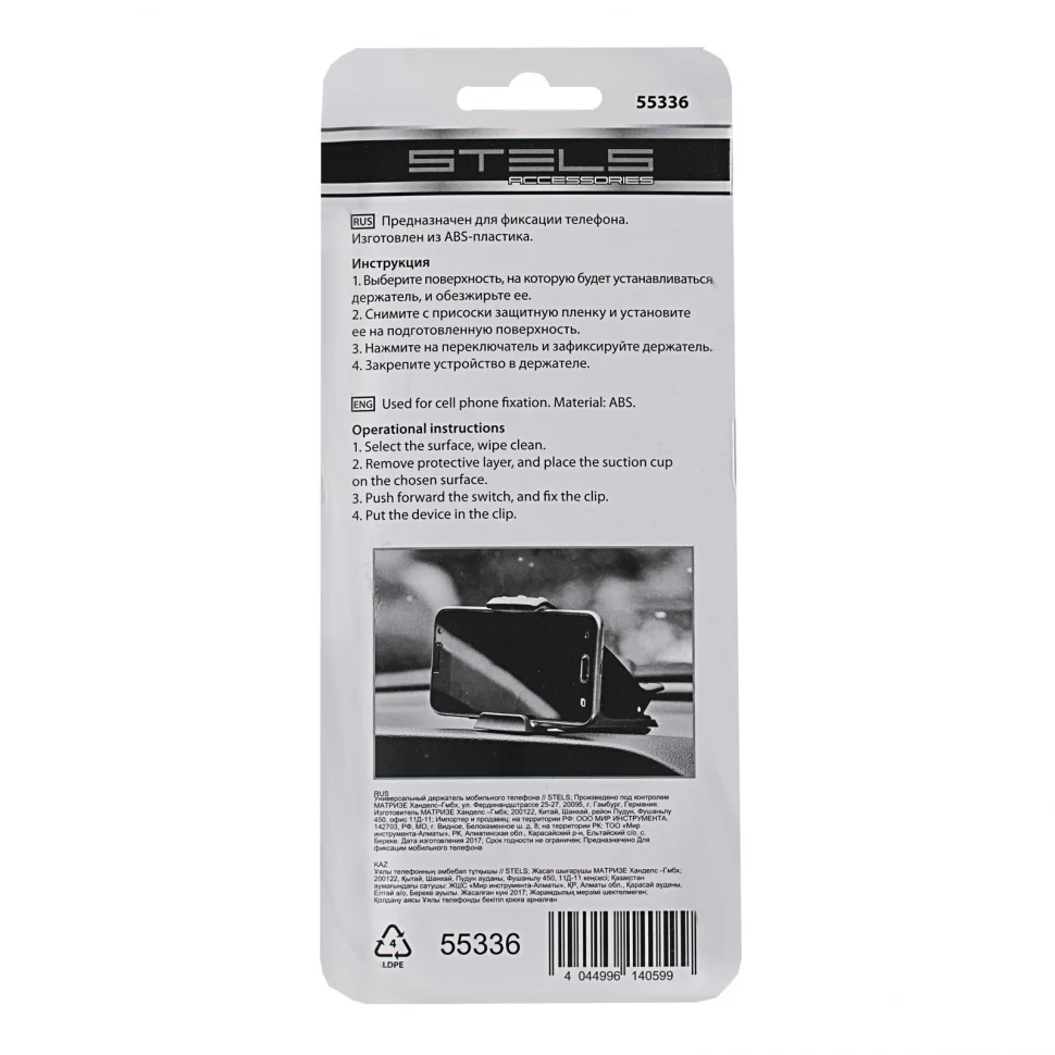 Универсальный держатель мобильного телефона Stels 55336 предназначен для использования в автомобиле. Позволяет с удобством просматривать карты, пользоваться различными приложениями, включать любимую музыку и фильмы в дороге. Благодаря механизму «прищепка» держатель подходит для большинства моделей смартфонов.ПреимуществаУниверсальность — можно зафиксировать мобильный телефон от любого производителя.Быстрая фиксация — телефон крепится в держателе одной рукой за несколько секунд.Простое использование — поворотный рычаг позволяет вращать держатель, регулируя его положение.Надежность — изделие прочно фиксируется на приборной панели с помощью вакуумной присоски, что исключает риск падения телефона.Защита от царапин — мягкие зажимы не портят телефон даже при сильном сжатии.Долговечность — благодаря ударопрочному ABC-пластику держатель устойчив к механическим повреждениям и преждевременному износу.Устойчивость к перепадам температур — держатель сохраняет работоспособность и не разрушается как в мороз, так и в жаркую погоду (от -30 до +70 градусов Цельсия).Удобная упаковка — двойной блистер позволяет рассмотреть товар перед приобретением, а также обеспечивает его безопасное хранение.