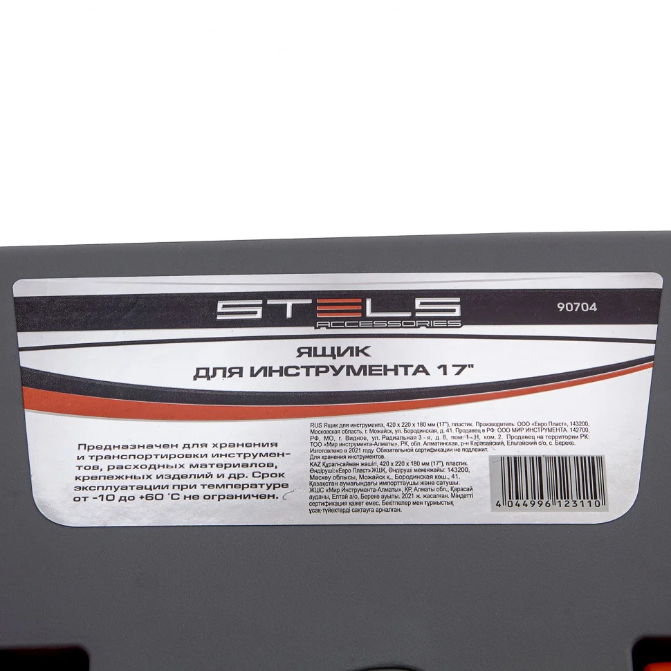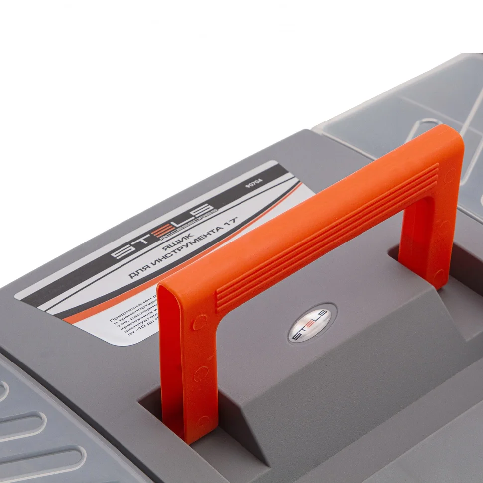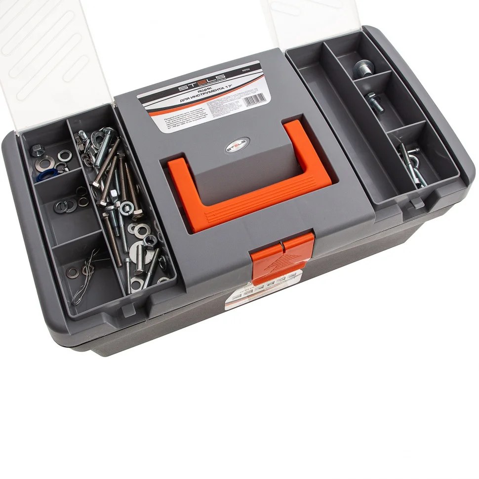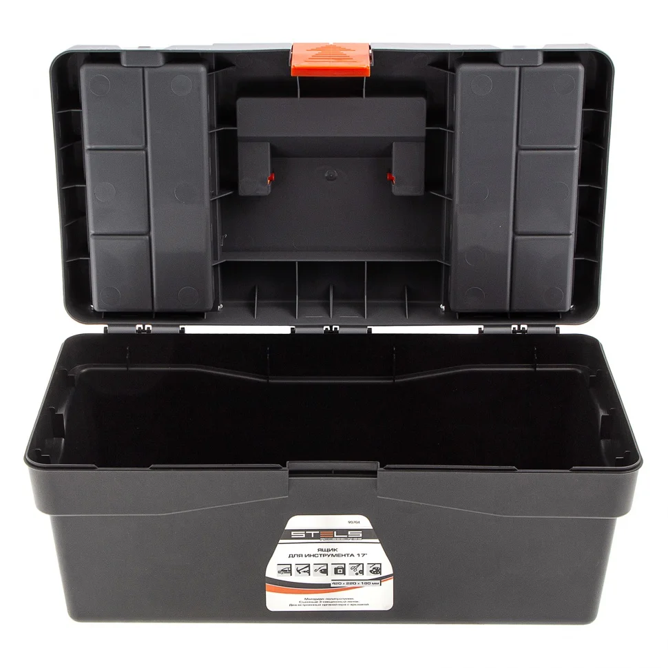 Ящик для инструмента Stels 90704, 17 дюймов, габаритами 420 х 220 х 180 мм, из пластика, предназначен для переноски и хранения инструментов, хозяйственных мелочей, рыболовных снастей. Содержимое не рассыпется, поскольку он надежно закрывается. Встроенные в крышку отделения обеспечивают быстрый доступ к крепежам и другим необходимым предметам. Большой ящик для хранения инструментов будет полезен дома, на даче, в гараже и на рыбалке.ПреимуществаЯщик выполнен из прочного и легкого пластика, рассчитан на долгий срок службы.На крышке предусмотрена ручка, облегчающая транспортировку контейнера.В ящике имеется съемный лоток, что позволяет удобно расположить инструменты разного размера, а также крепежи и мелкие детали.