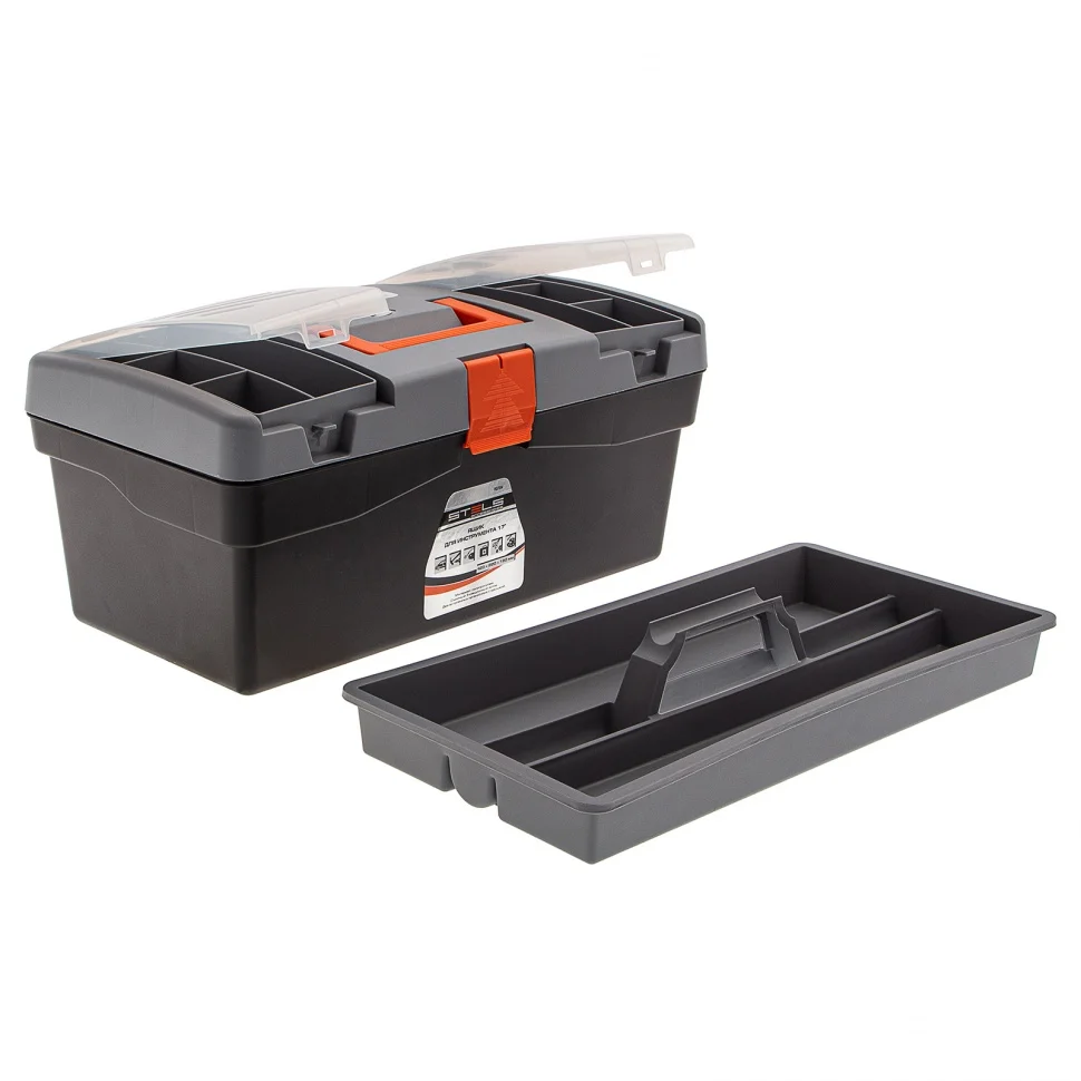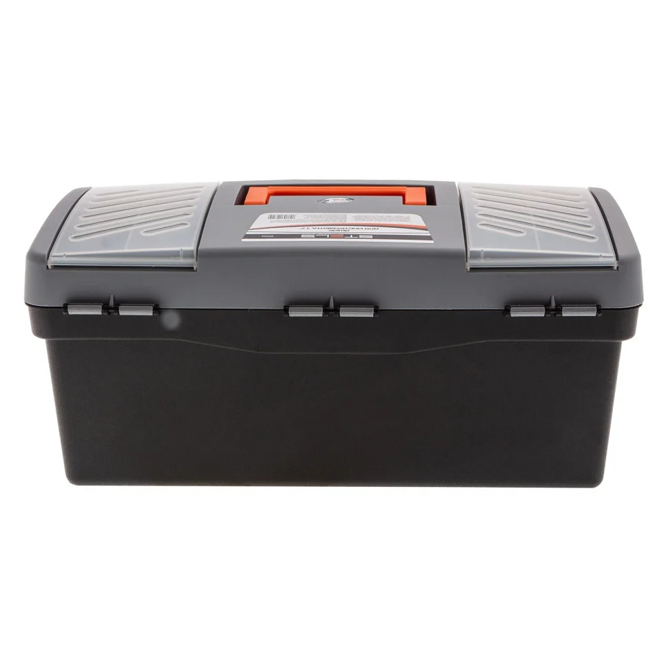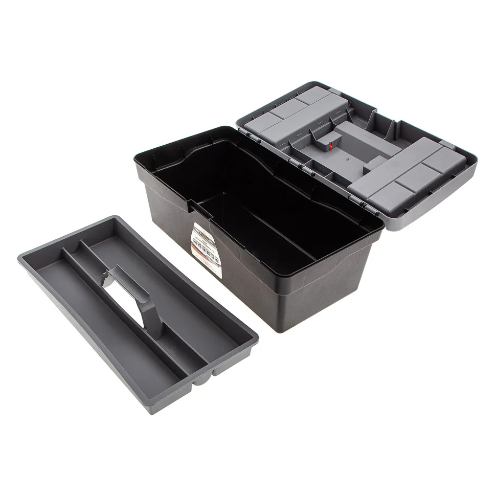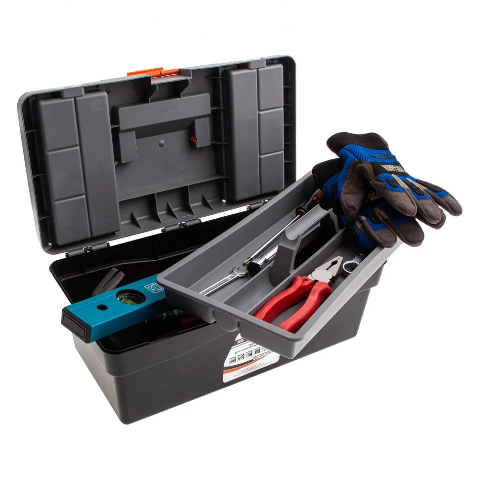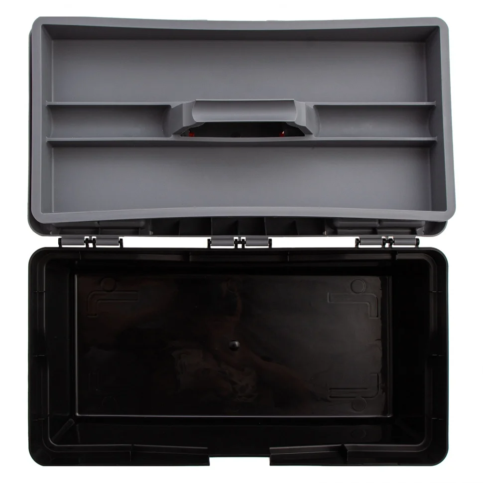 Ящик для инструмента Stels 90704, 17 дюймов, габаритами 420 х 220 х 180 мм, из пластика, предназначен для переноски и хранения инструментов, хозяйственных мелочей, рыболовных снастей. Содержимое не рассыпется, поскольку он надежно закрывается. Встроенные в крышку отделения обеспечивают быстрый доступ к крепежам и другим необходимым предметам. Большой ящик для хранения инструментов будет полезен дома, на даче, в гараже и на рыбалке.ПреимуществаЯщик выполнен из прочного и легкого пластика, рассчитан на долгий срок службы.На крышке предусмотрена ручка, облегчающая транспортировку контейнера.В ящике имеется съемный лоток, что позволяет удобно расположить инструменты разного размера, а также крепежи и мелкие детали.