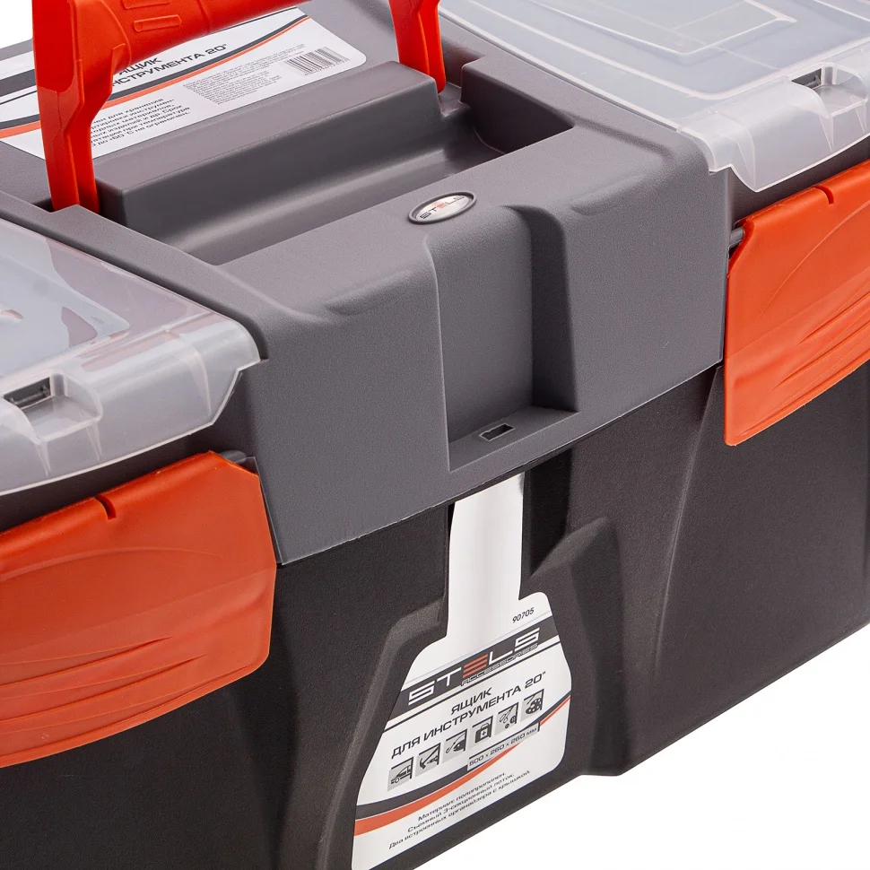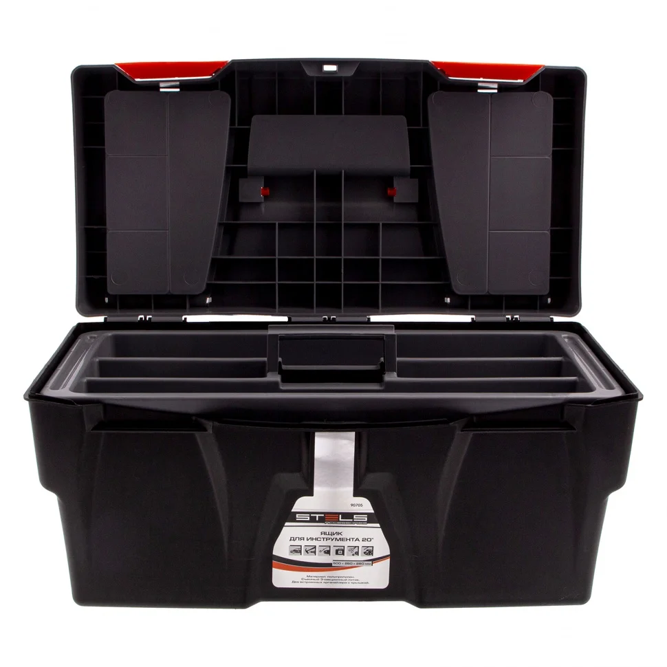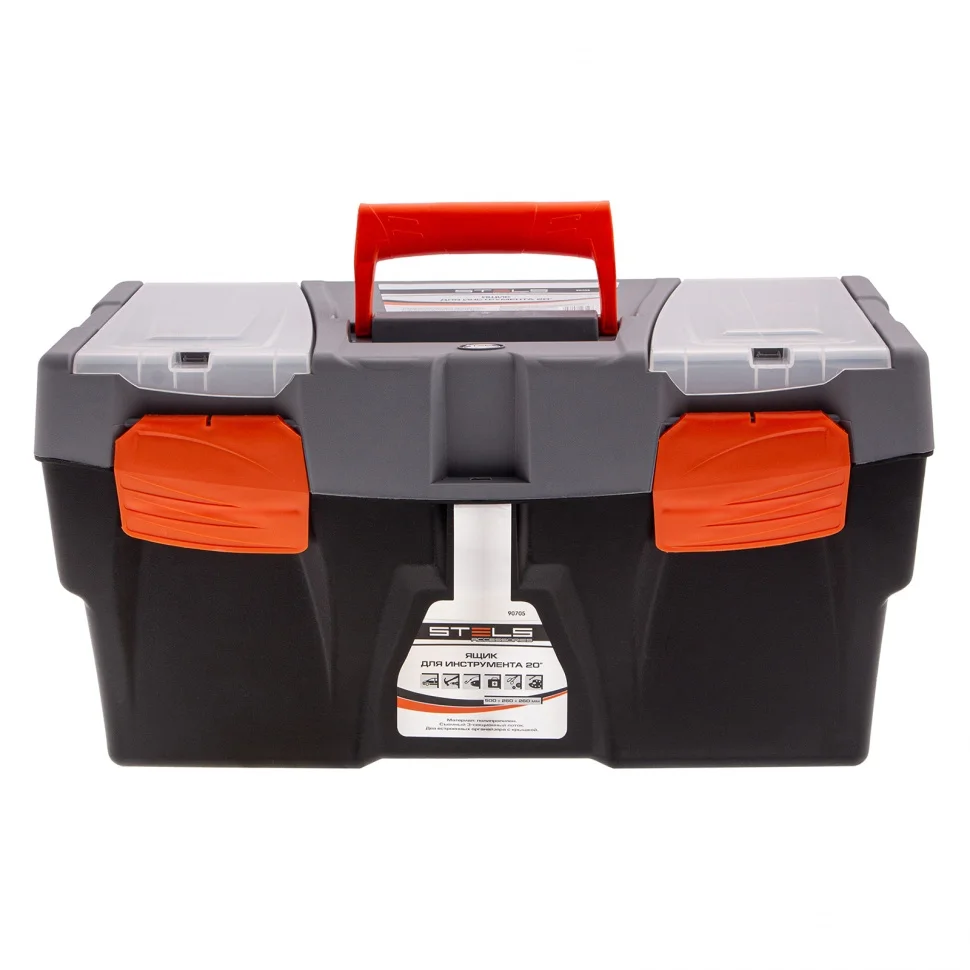 Ящик для инструмента Stels 90705, 20 дюймов, габаритами 500 х 260 х 260 мм, из пластика, предназначен для переноски и хранения инструментов, хозяйственных мелочей, рыболовных снастей. Содержимое не рассыпется, поскольку он надежно закрывается. Встроенные в крышку отделения обеспечивают быстрый доступ к крепежам и другим необходимым предметам. Большой ящик для хранения инструментов будет полезен дома, на даче, в гараже и на рыбалке.ПреимуществаЯщик выполнен из прочного и легкого пластика, рассчитан на долгий срок службы.На крышке предусмотрена ручка, облегчающая транспортировку контейнера.В ящике имеется съемный лоток, что позволяет удобно расположить инструменты разного размера, а также крепежи и мелкие детали.