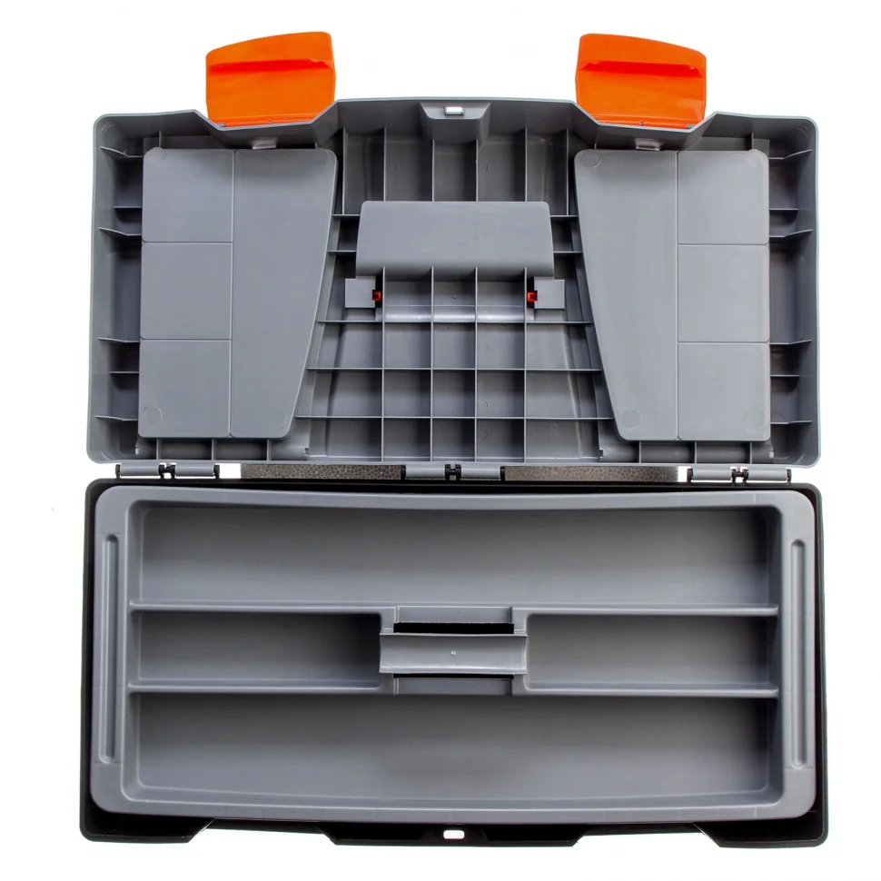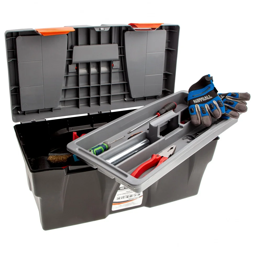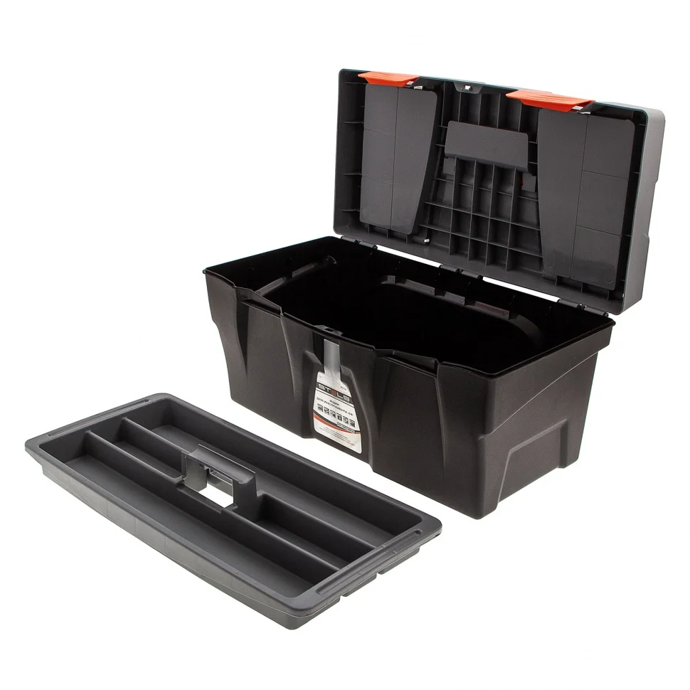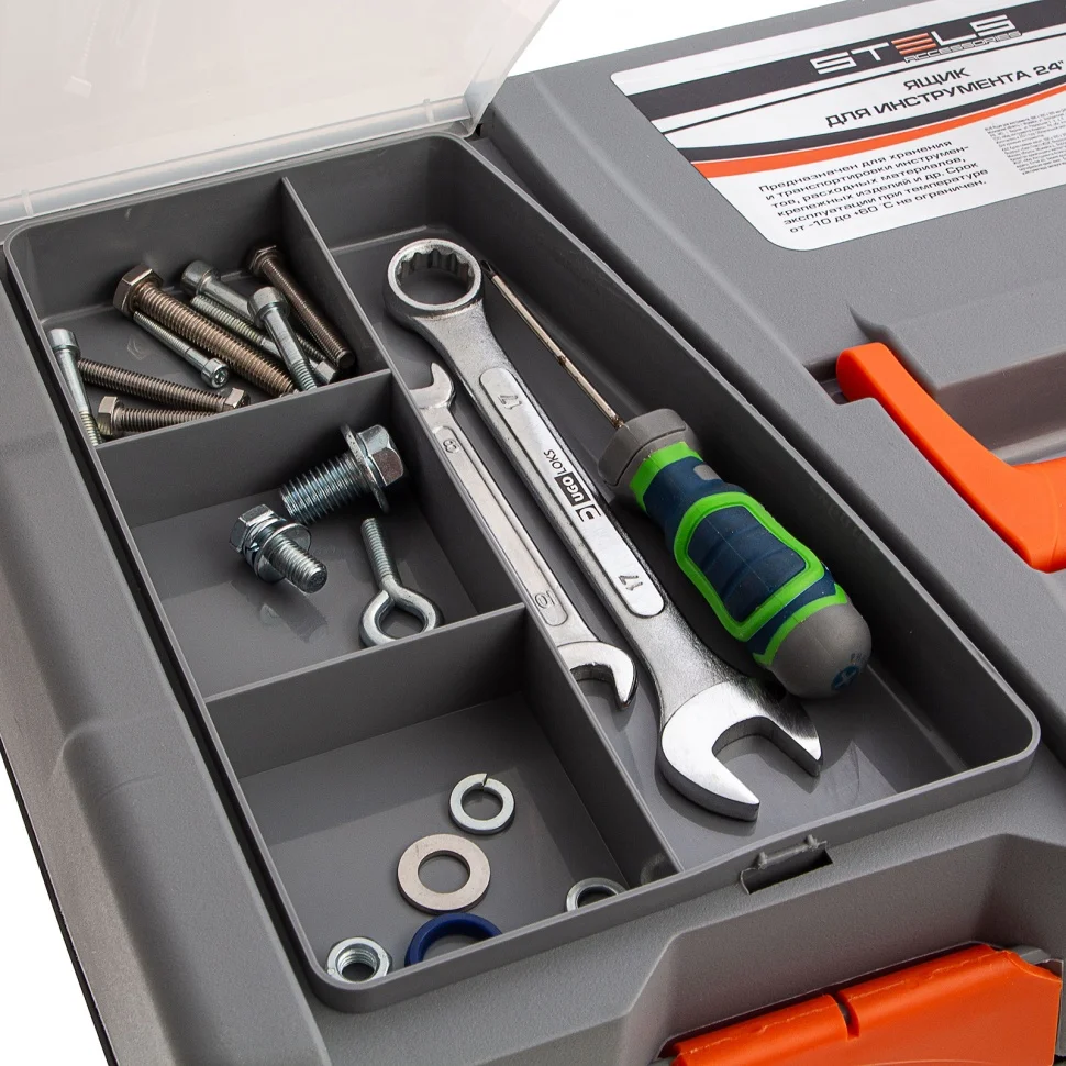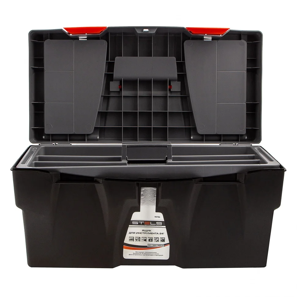 Ящик для инструмента Stels 90706, 23 дюймов, габаритами 590 х 300 х 300 мм, из пластика, предназначен для переноски и хранения инструментов, хозяйственных мелочей, рыболовных снастей. Содержимое не рассыпется, поскольку он надежно закрывается. Встроенные в крышку отделения обеспечивают быстрый доступ к крепежам и другим необходимым предметам. Большой ящик для хранения инструментов будет полезен дома, на даче, в гараже и на рыбалке.