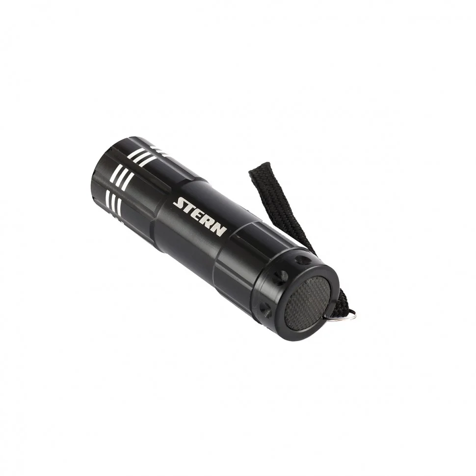 Бытовой алюминиевый фонарь Stern 90506 с гравировкой, в черном корпусе, 9 LED, с питанием от 3 батареек типа AAA, предназначен для бытового использования. Он подсветит небольшое помещение или участок местности в темное время суток. 9 светодиодов дают яркое световое пятно. Фонарь оригинально смотрится благодаря чёрному корпусу с гравировкой.ПреимуществаКорпус выполнен из коррозионностойкого алюминия, поэтому фонарь прослужит долго.Фонарь питается от 3 батареек типа AAA(приобретаются отдельно), поэтому не нужно искать розетку для подзарядки.Длина фонаря составляет всего 93 мм, поэтому он легко поместится даже в кармане или маленькой сумочке.Ремешок для крепления на запястье предотвратит случайное падение фонаря.