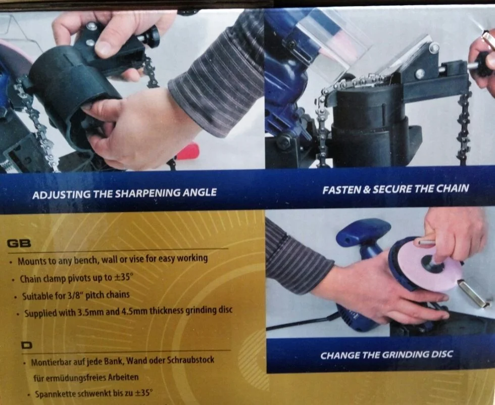 - Выполняет заточку всех типов цепей с шагом от 1/4 дюйма до 3/8 дюйма.