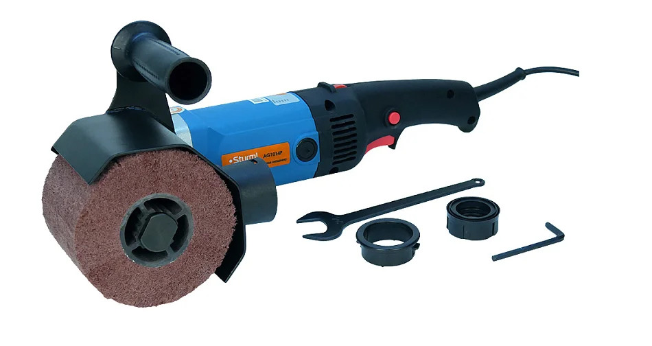 Sturm AG1014P – мощная универсальная щеточная машина профессиональной серии инструмента Sturm. Предназначена для выполнения шлифовочных работ по древесине, металлу, камню и т д. Благодаря компоновке с длинной рукоятью, оптимальным массово-габаритным показателям, а также нейтральному центру тяжести инструмент отлично сбалансирован и хорошо контролируется в работе. Главная особенность модели, выделяющая ее среди аналогов – наличие блока EPM (Electronic Power Manager) который гарантирует поддержание стабильной скорости оснастки, препятствуя падению оборотов под нагрузкой, обеспечивает плавный запуск инструмента, без стартового рывка, а также возможность регулировки оборотов в широком диапазоне. Модель имеет повышенные надежность и ресурс, как за счет применения качественных комплектующих, так и благодаря продуманной, с запасом по прочности, конструкции: электромотор покрыт несколькими изоляционными слоями термостойкого лака и имеет дополнительную защиту от пыли и абразивных частиц, благодаря закалке, повышенной износостойкостью обладают шестерни редуктора, корпус инструмента изготовлен с использованием нейлона, что способствует его долговечности. Металлический защитный кожух оборудован патрубком для подключения строительного пылесоса и позволяет эффективно удалять пыль из рабочей зоны. Предусмотрена возможность быстрого доступа к щеткам, без предварительного демонтажа элементов корпуса – это значительно упрощает процесс их замены.
