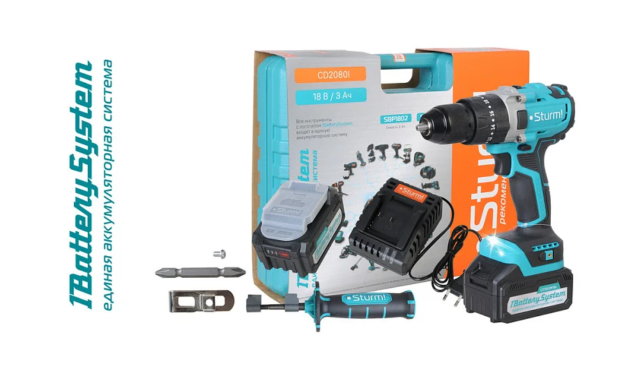 Дрель аккум б/щ удар. Sturm!, 18В, 1BatterySystem, 80Нм, 2х3.0Ач, 5в1, доп. рук, кейс CD2080I