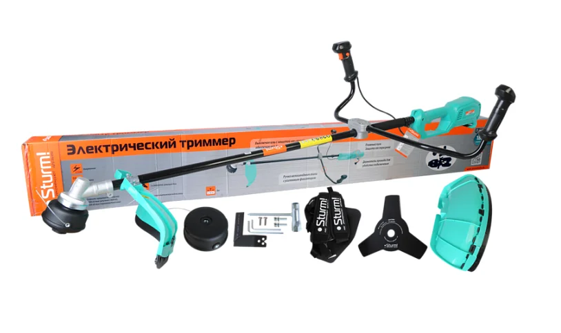 Sturm GT1800BS – универсальная мощная электрическая коса для ухода за приусадебной территорией. Имеет компоновку с верхним расположением двигателя, что дает возможность применять ее для скашивания мокрой травы, так как исключается непосредственный контакт влаги с электрочастью. Кроме того, размещение мотора сверху обеспечивает инструменту отличную развесовку. Модель оснащена производительным 1.8 кВт двигателем, развивающим максимальную частоту вращения режущей оснастки 7500 об / мин и позволяет уверенно использовать при работе режущую леску максимальным диаметром до 2.5 мм. Благодаря наличию стального приводного вала, крутящий момент от двигателя к редуктору передается практически без потерь, что позволяет уверенно использовать не только стандартные косильные катушки, но и металлические трехлопастные ножи для скашивания жесткой, перезрелой травы и бурьяна. Инструмент максимально прост в использовании. Этому способствуют отличная эргономика и небольшой вес. Кроме того, в отличии от бензиновых аналогов, электрическая коса не требует предварительной подготовки (приготовление топливной смеси, заправка), работает без вредного выхлопа и с невысоким уровнем шума. Значительный комфорт для пользователя обеспечивает применение на модели Sturm GT1800BS – U-образной ассиметричной рукояти «велосипедного типа» – она обеспечивает отличный контроль инструмента, а благодаря большому плечу позволяет захватывать значительную площадь за один заход. Предусмотрена возможность продольной регулировки рукояти. Для защиты пользователя от возможного случайного запуска инструмента на рукоятке управления установлена клавиша-фиксатор, блокирующая кнопку пуска – запуск возможен лишь после ее предварительного нажатия. Еще один элемент безопасности – специальный зацепной крюк в нижней части корпуса, предназначенный для надежной фиксации сетевого удлинителя к косе, чтобы в случае необходимости быстро отключить инструмент от электросети. В штатную комплектацию модели Sturm GT1800BS входят катушка с леской, трехлопастной режущий нож, ранцевый ремень и набор аксессуаров для сборки.