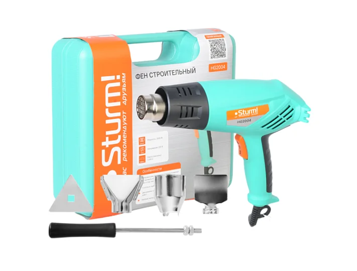 Sturm HG2004 — мощный универсальный технический фен бытового назначения. Инструмент обладает небольшими размерами и массой, за счет чего максимально удобен в использовании и отлично подходит для работ в условиях ограниченного пространства. Надежность хвата обеспечивают резиновые накладки на рукояти. Устройство может использоваться не только как мобильное, но и как стационарное — особая форма корпуса со специальной ребристой площадкой позволяет для большего удобства устанавливать фен в вертикальном положении, либо под углом в 15°. Модель имеет два режима работы, выбор между которыми производится с помощью переключателя. Режим пониженной производительности обеспечивает максимальную температуру нагрева в 350°C при скорости выдува воздушного потока 250 л/мин, режим повышенной производительности — максимальная температура нагрева 550°C при скорости выдува воздушного потока 550 л/мин — в зависимости от конкретной задачи пользователь выбирает наиболее подходящий.