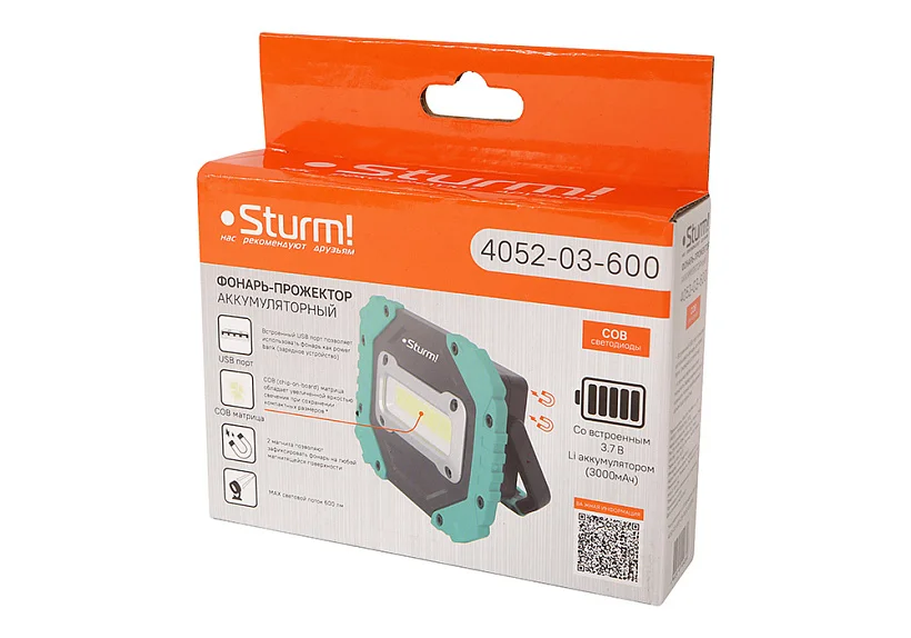 Фонарь-прожектор аккумуляторный 600лм, COB светодиод, 2 магнита, Sturm! 4052-03-600