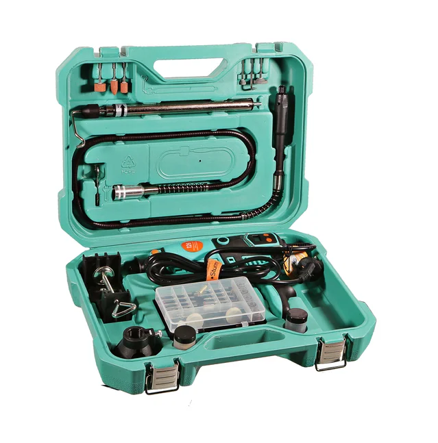 Три цанги разных диаметров и широкий набор насадок в удобном пластиковом кейсе с внутренним органайзером для работы с разными материалами: металл, камень, стекло, пластмасса и т.д.,