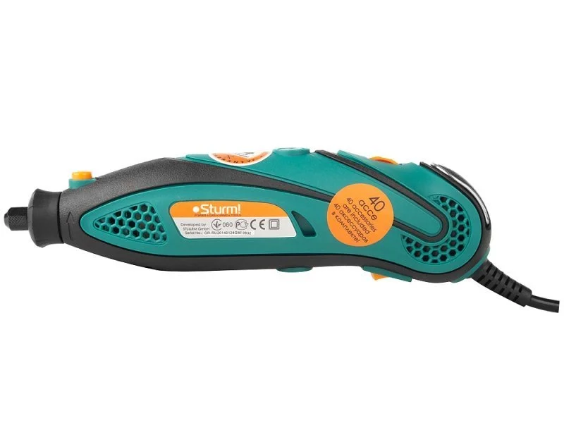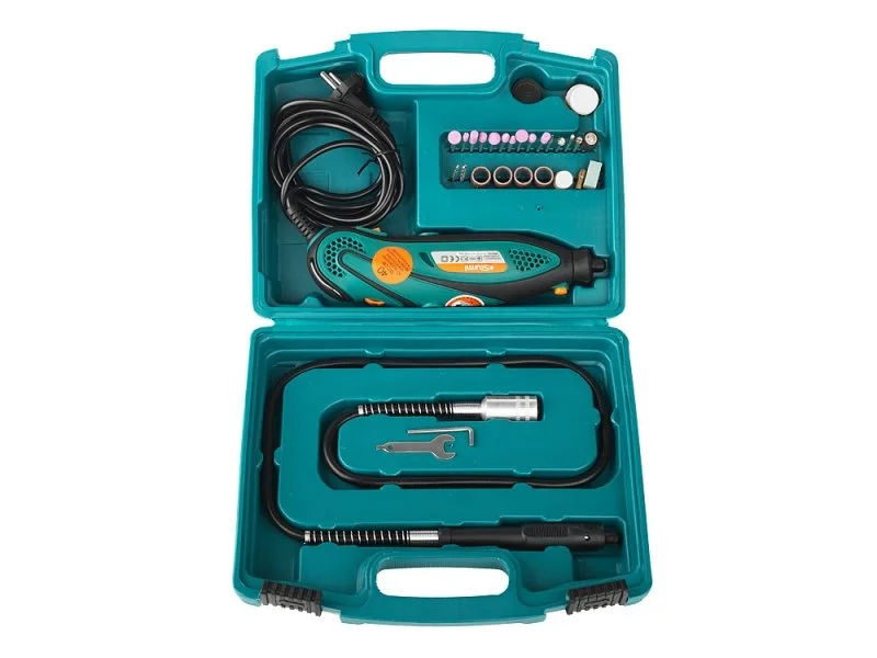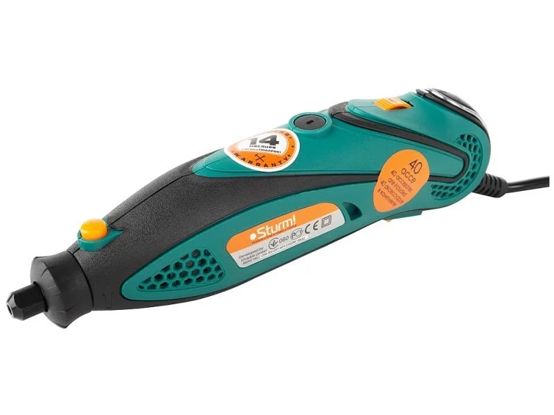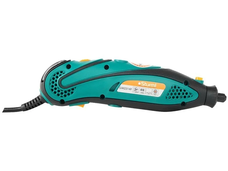 Электрический гравер Sturm GM2314F имеет регулировку оборотов, что позволяет выбрать оптимальный режим работы. Благодаря блокировке шпинделя, заменить оснастку не составляет труда. Гибкий вал, входящий в комплект, помогает при работе в труднодоступных местах. Модель поставляется с 40 аксессуарами в пластиковом кейсе.
