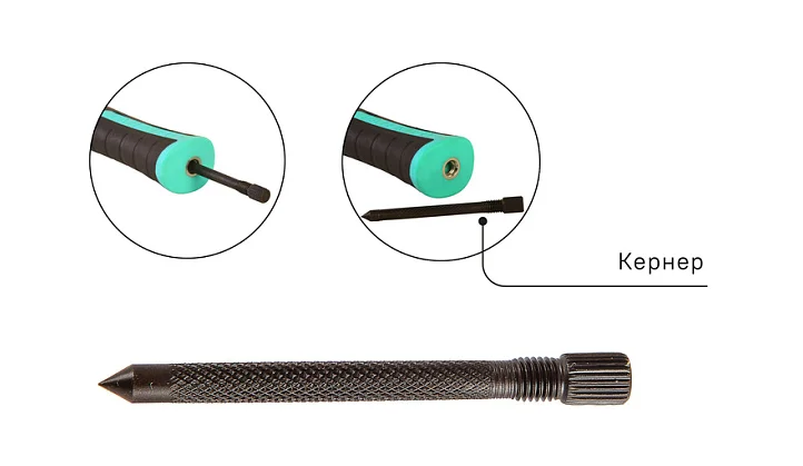 Резьбовая фиксация кернера исключает случайную потерю, широкая рифленая захватная часть служит для удобного извлечения и возврата на место