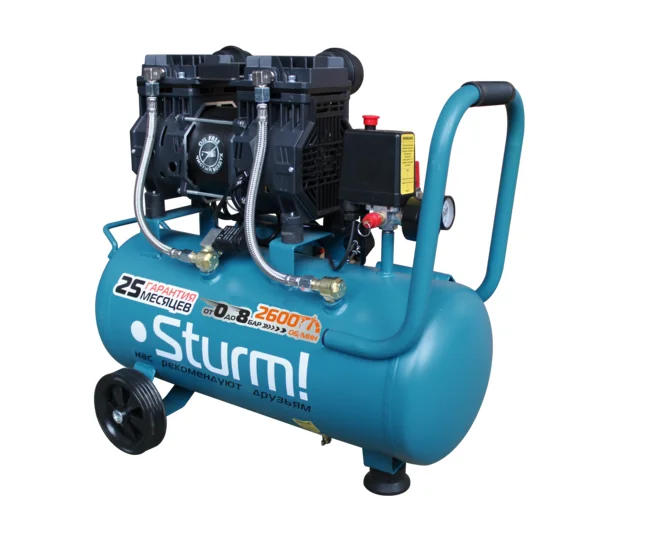 Sturm AC93250OL – универсальный поршневой компрессор с 50-ти литровым ресивером – идеально подходит, как для домашнего использования, так и для легких профессиональных задач. Главная особенность устройства ¬– наличие безмасляного компрессорного блока, обеспечивающего подачу чистого сжатого воздуха без примесей масла, что делает Sturm AC93250OL идеальным вариантом для применения в таких областях, как медицина, пищевая промышленность или покраска. Кроме того, в отличии от масляных аналогов компрессор безмасляной конструкции имеет более низкий показатель по шумовому давлению, что значительно снижает дискомфорт при использовании в помещениях, и легче запускается в условиях низких температур. На модели установлен надежный 1.5 кВт двигатель и мощный компрессорный блок, которые позволяют развить максимальную производительность в 240 л / мин. Привод компрессорного блока – прямой (коаксиальный), непосредственно от вала двигателя – это упрощает конструкцию и делает ее более компактной. Порошковое напыление ресивера обеспечивает его высокую стойкость к коррозии, перепадам температуры и механическим воздействиям, а также защищает от ультрафиолетового излучения (почти полное отсутствие выцветания). Компрессор прост в эксплуатации и обслуживании – все органы управления и контроля скомпонованы в единый блок и находятся на виду: пара манометров контроля давления, прессостат для безопасного автоматического управления уровнем давления, устройство защиты от перегрузки. Модель максимально удобна в обслуживании: хороший доступ к воздушному фильтру позволяет произвести его очистку или замену всего в несколько приемов, а предусмотренный конструкцией кран для удаления конденсата обеспечивает простую очистку ресивера для улучшения качества подаваемой воздушной массы. Мобильности перемещения компрессора способствуют транспортировочные колеса и прочная рукоять.
