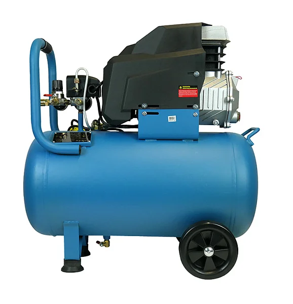 Компрессор, колеса (2 шт), передняя опорная ножка, комплект крепления колес и опорной ножки, воздушный фильтр, сапун, инструкция по эксплуатации.