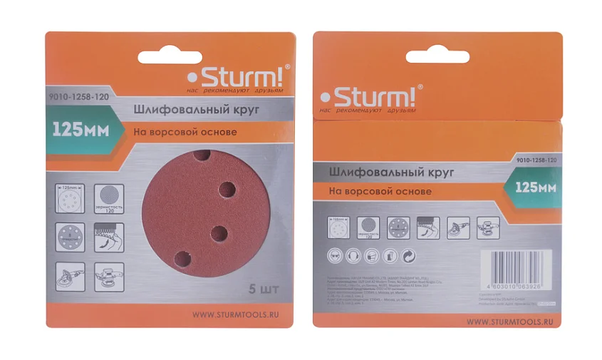 Круг шлифовальный Sturm! "под липучку", d125мм, зерн. 120, 8 отв., 5 штук. 9010-1258-120